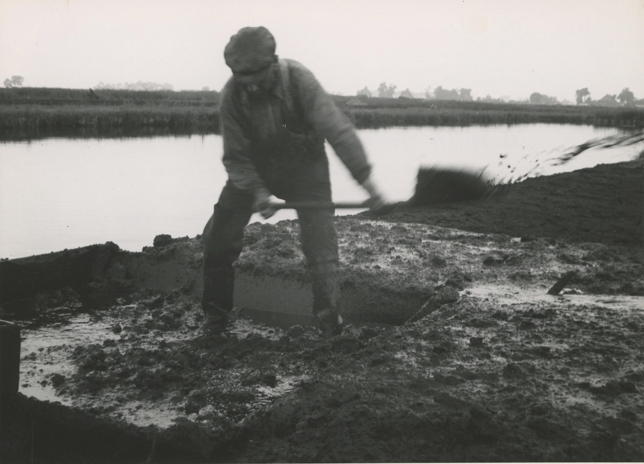 Een menger aan het werk in het veen bij Oldemarkt. De menger trapt in een houten mengbak de opgebaggerde veenkluiten fijn en mengt ze met water tot baggerspecie. Vervolgens werpt hij de veenbrij met een 'jutte' uit over de legakker. Een jutte is een houten schop met een opstaande rand.