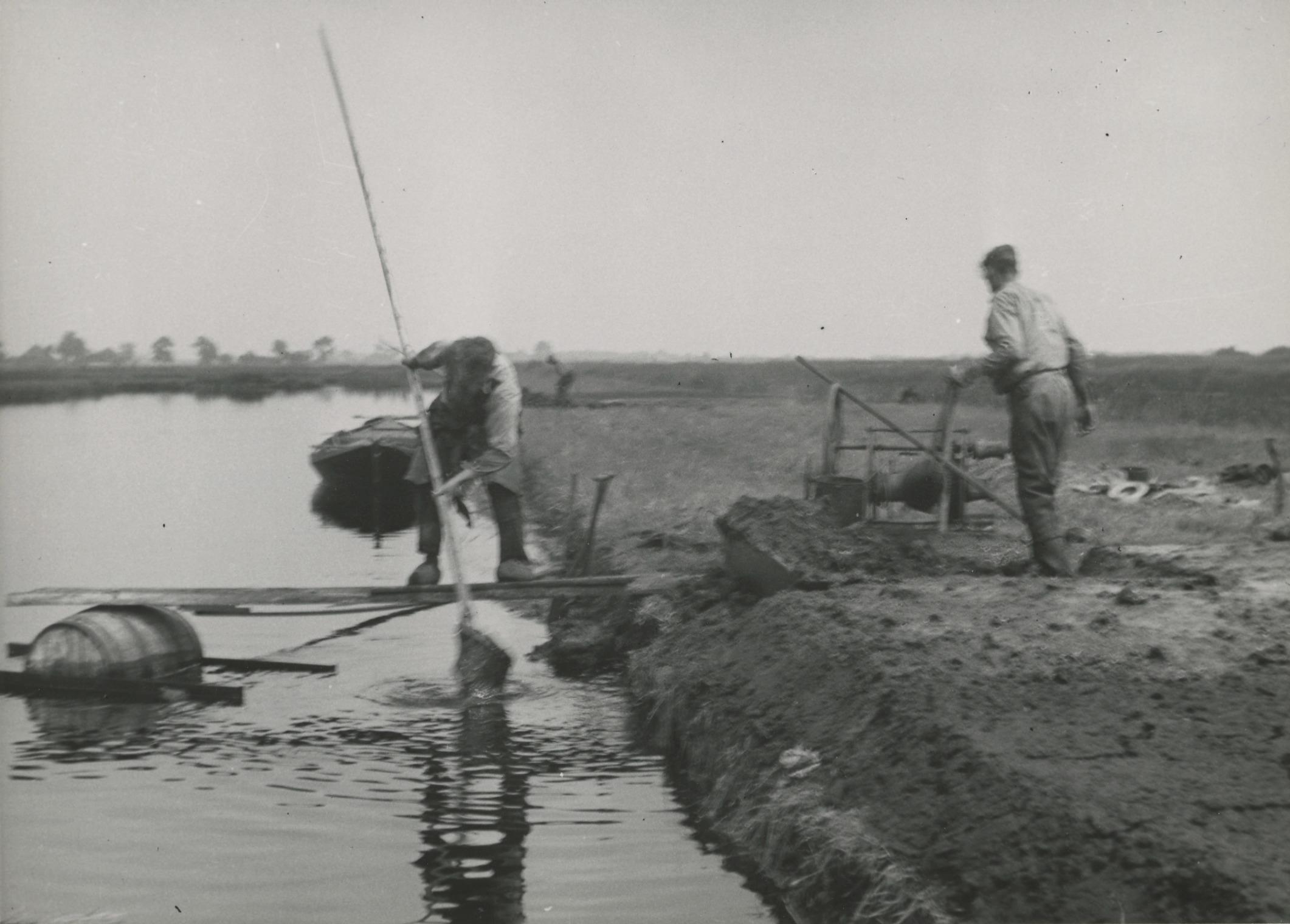 Een veentrekker en een menger aan het werk in het veen bij Oldemarkt. In het water drijft het zogenoemde vlot, bestaande uit een houten ton met planken aan de boven- en onderkant. De 'trekplank' rust aan de ene zijde op de ton en aan de andere zijde op de wal. De turftrekker staat tijdens het ...