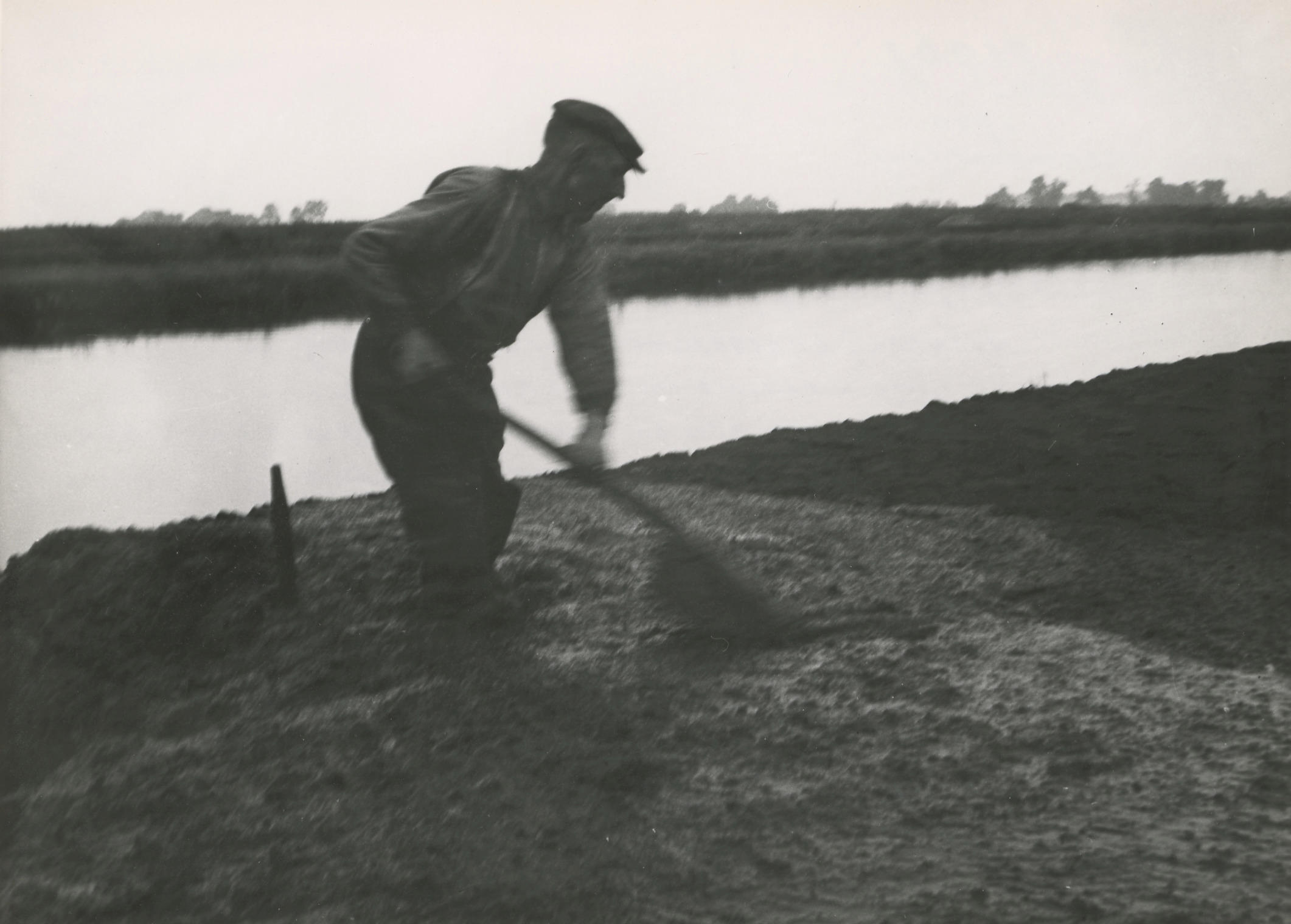 Een menger aan het werk in het veen bij Oldemarkt. De menger trapt in een houten mengbak de opgebaggerde veenkluiten fijn en mengt ze met water tot baggerspecie. Met een 'jutte', een houten schop met een opstaande rand, werpt hij de veenbrij uit over de legakker.