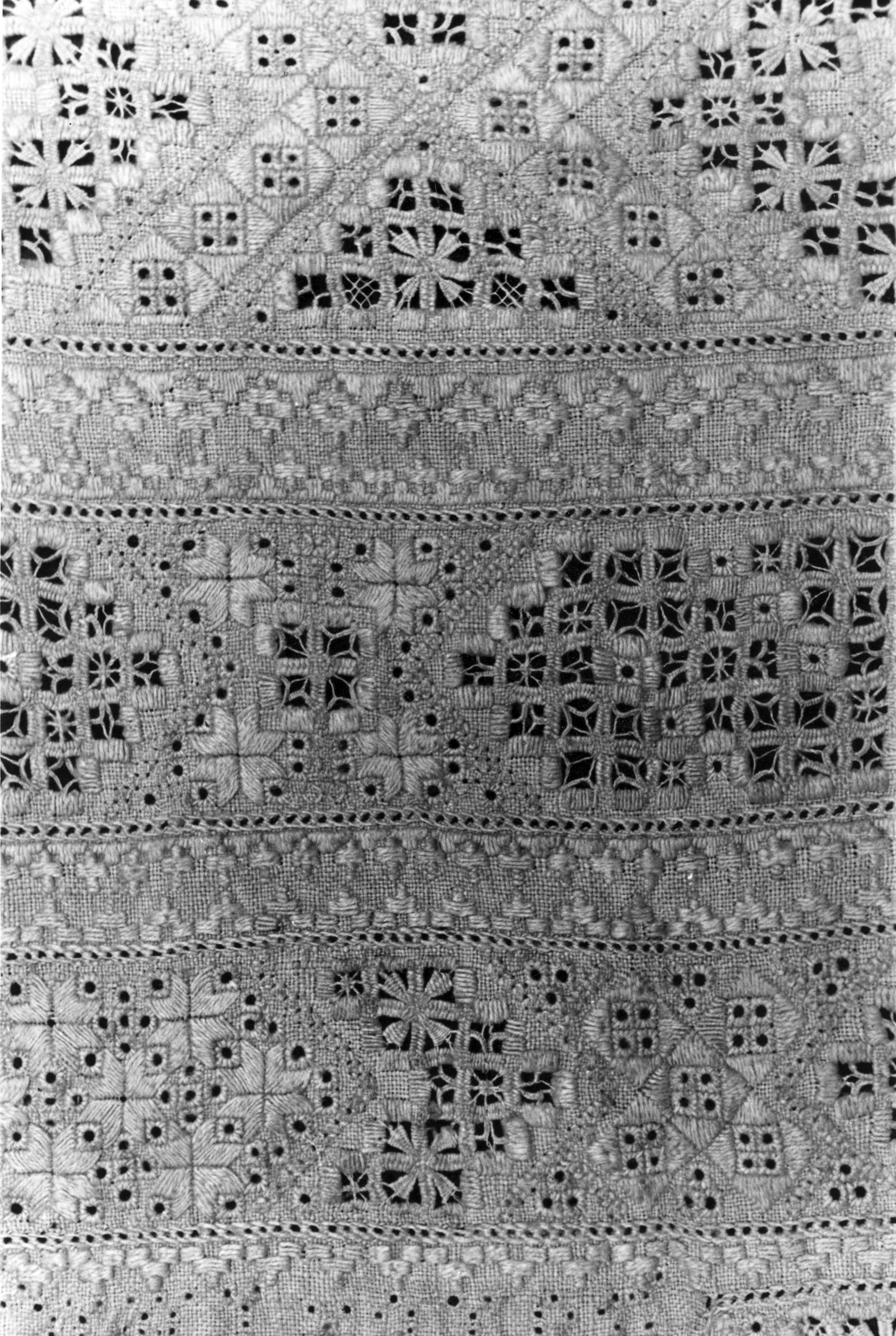 Detail van een wit- en sneewerklap, Marken, 1943 (zwart-wit foto)