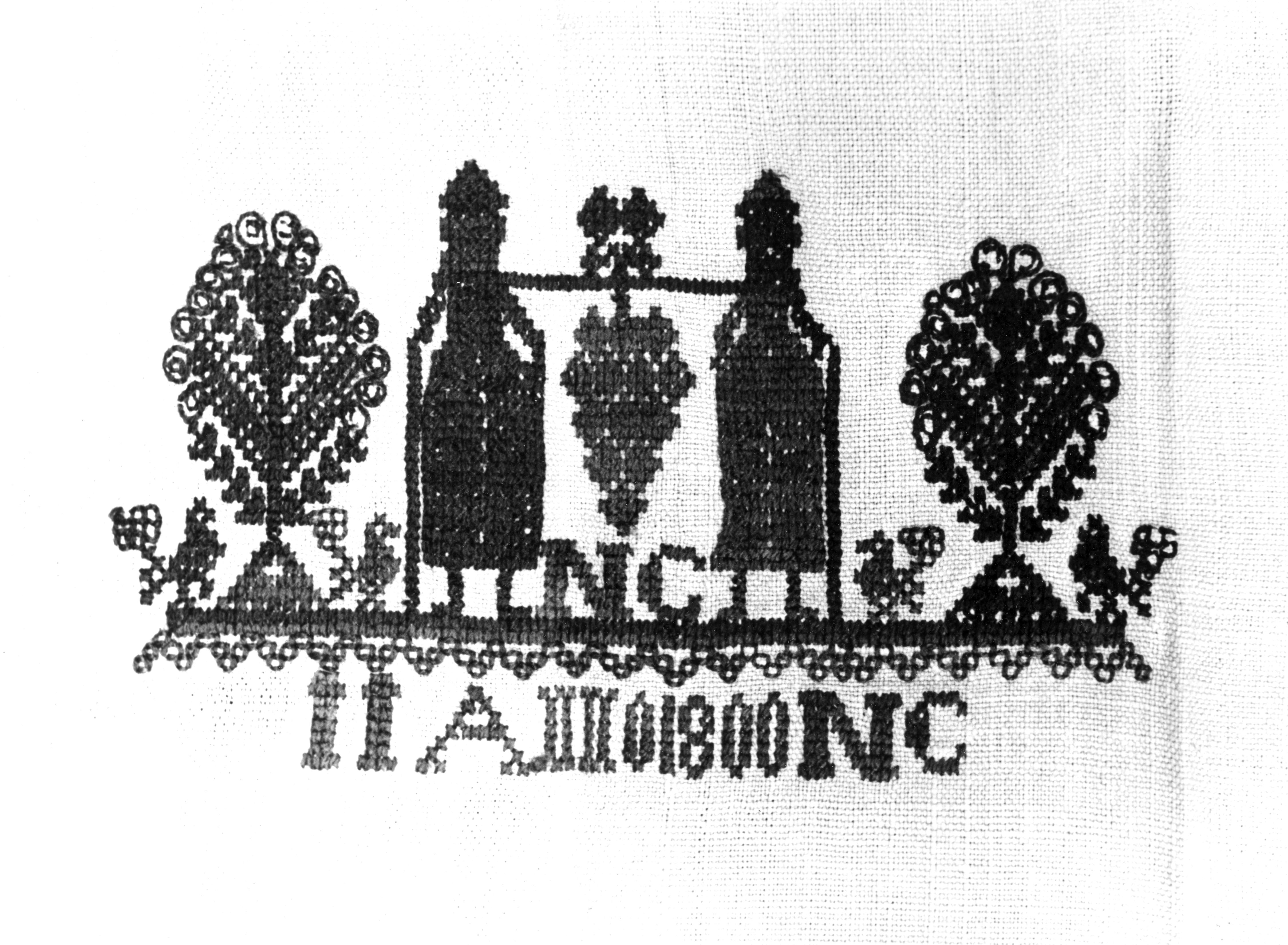 Detail van een zogenoemd spreitje, gebruikt op een pronkbedstede op het eiland Marken, met een voorstelling in kruissteekborduurwerk van de verspieders Kanaäns, de datering 'ANNO 1800' en de initialen 'N.C.'