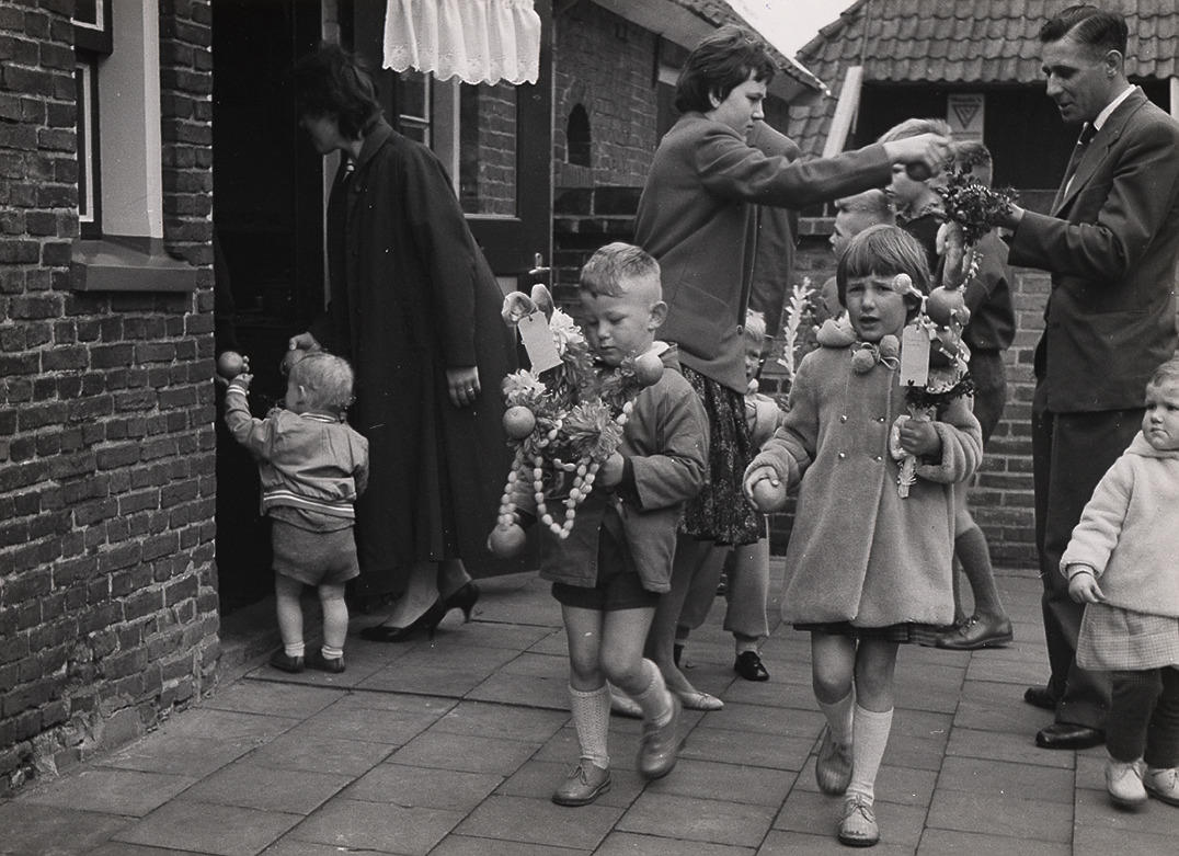 Afbeelding van kinderen in 1960, die begeleid door volwassenen een traktatie halen bij bepaalde adressen. De kinderen dragen winterkleding. Hun stokken zijn versierd met een broodhaantje, fruit, paaseitjes en franjes.