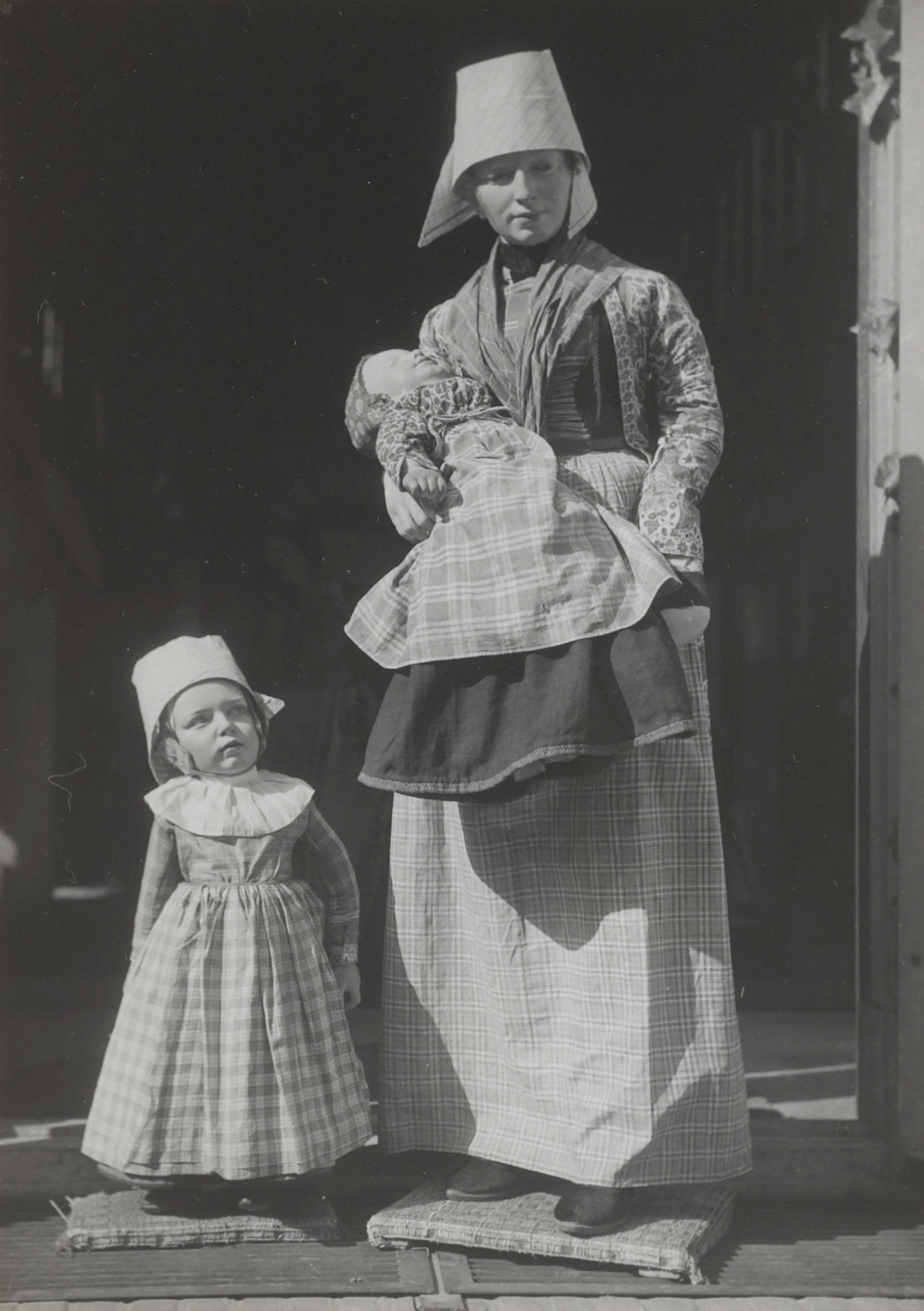 Drie poppen in Hindelooper streekdracht, gefotografeerd tijdens de ontruiming van de streekdrachttentoonstelling in het Nederlands Openluchtmuseum vanwege de evacuatie van de museumcollectie in 1943. Deze Hindelooper drachten maakten geen deel uit van de oorspronkelijke 1898-collectie.