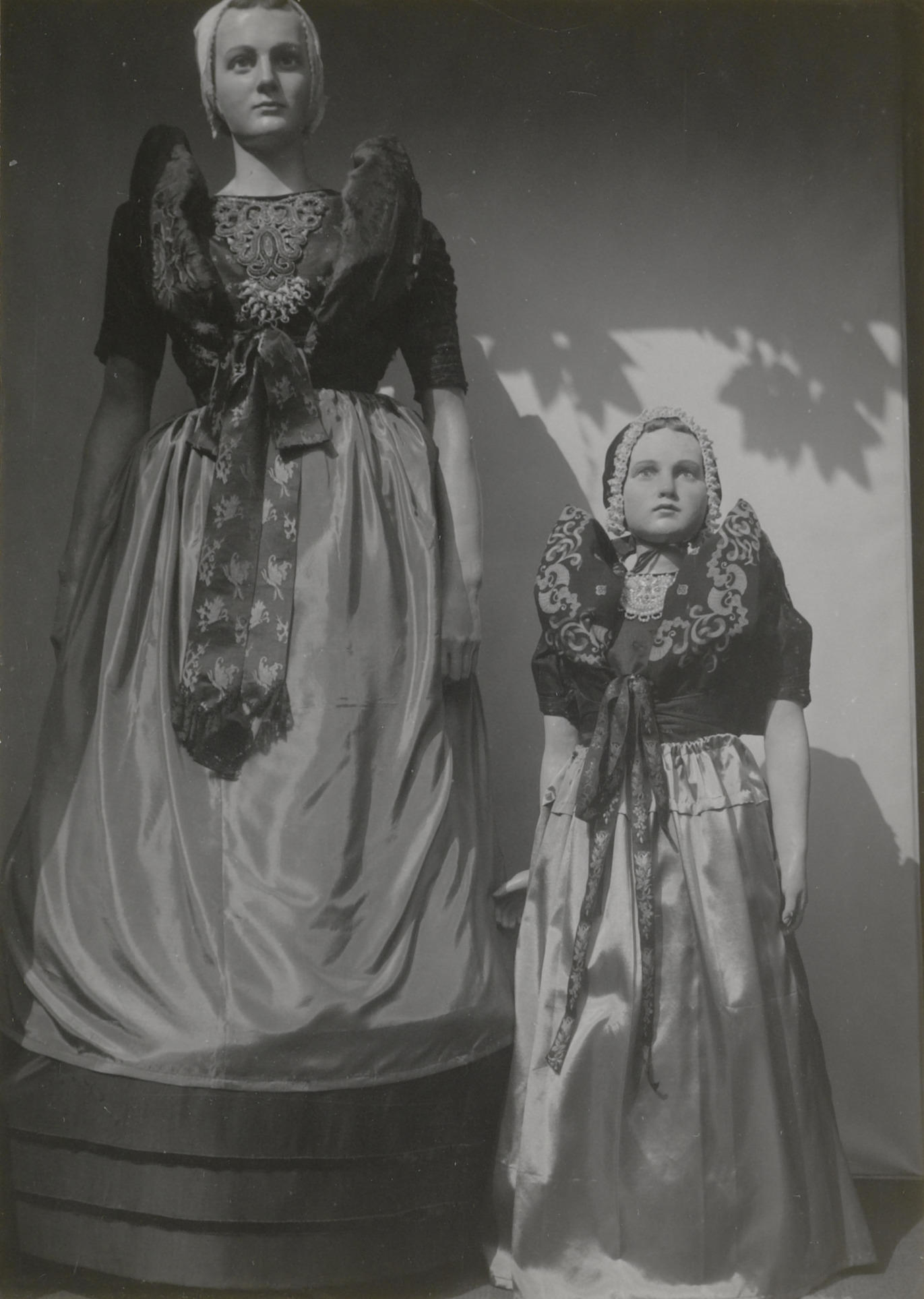 Twee poppen in Axelse streekdracht, gefotografeerd tijdens de ontruiming van de streekdrachttentoonstelling in het Nederlands Openluchtmuseum vanwege de evacuatie van de museumcollectie in 1943. De beide oorijzers, oorijzerhangers en kralenkettingen zijn verwijderd voor de evacuatie.
