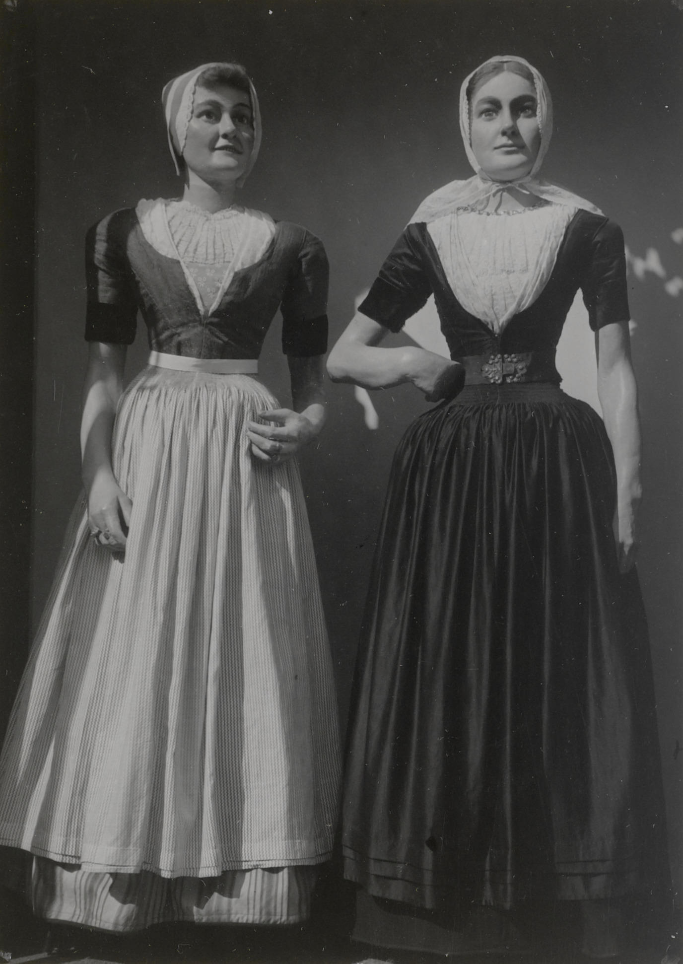 Twee poppen in Walcherse streekdracht, gefotografeerd tijdens de ontruiming van de streekdrachttentoonstelling in het Nederlands Openluchtmuseum vanwege de evacuatie van de museumcollectie in 1943. De pop links draagt kleding van de kermisgast en de pop rechts is gekleed in de dracht uit het Middelburger Ambacht. De oorijzers, oorijzerhangers van beide poppen en de voorhoofdsnaald van ...
