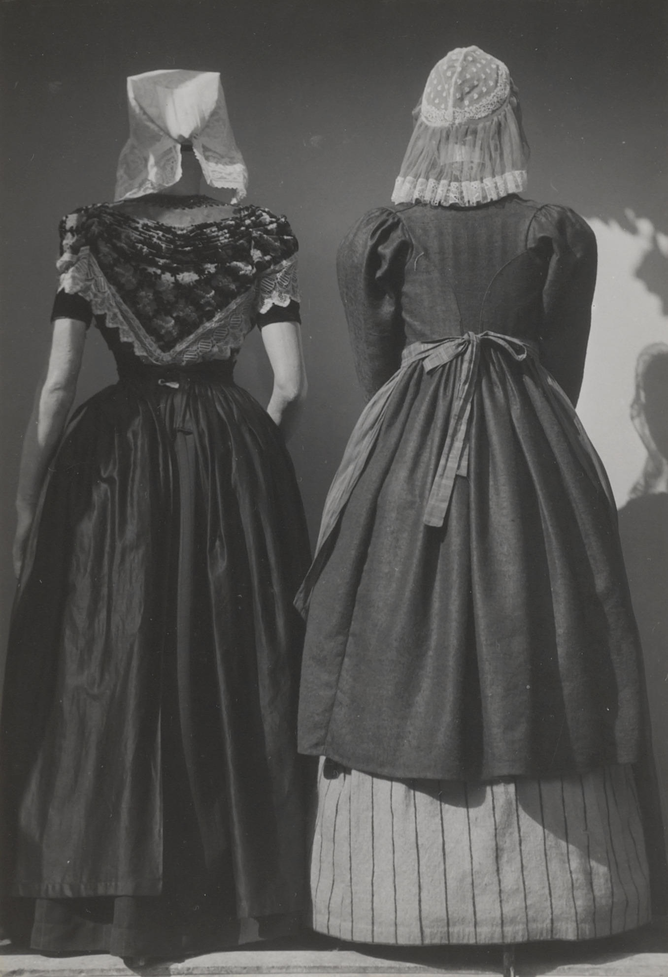 Twee poppen in streekdracht, gefotografeerd tijdens de ontruiming van de streekdrachttentoonstelling in het Nederlands Openluchtmuseum vanwege de evacuatie van de museumcollectie in 1943. De pop links is gekleed in protestantse Zuid-Bevelandse dracht, de 'boerendochter des zondags'. De pop rechts draagt ouderwetse dracht uit Noord-Drenthe. De oorijzers en overige losse sieraden zijn voor de evacuatie verwijderd.
