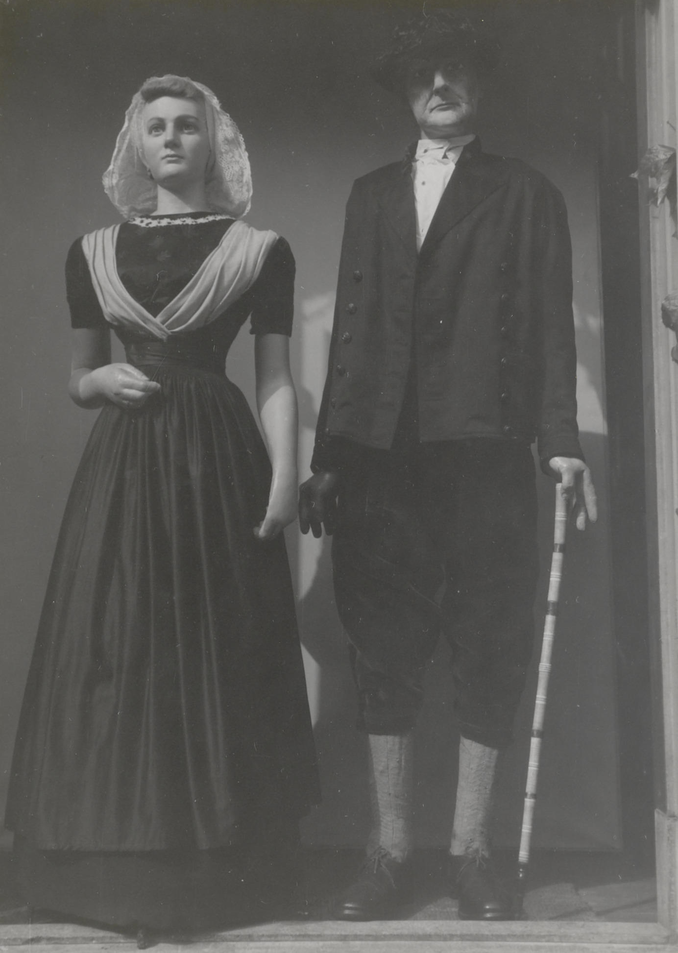 Twee poppen in Zuid-Bevelandse streekdracht, gefotografeerd tijdens de ontruiming van de streekdrachttentoonstelling in het Nederlands Openluchtmuseum vanwege de evacuatie van de museumcollectie in 1943. De pop links draagt de dracht van een protestantse bruid en de pop rechts is gekleed in de ouderwetse dracht van een katholieke boer. Het oorijzer, de mutsspelden en de kralenketting ...