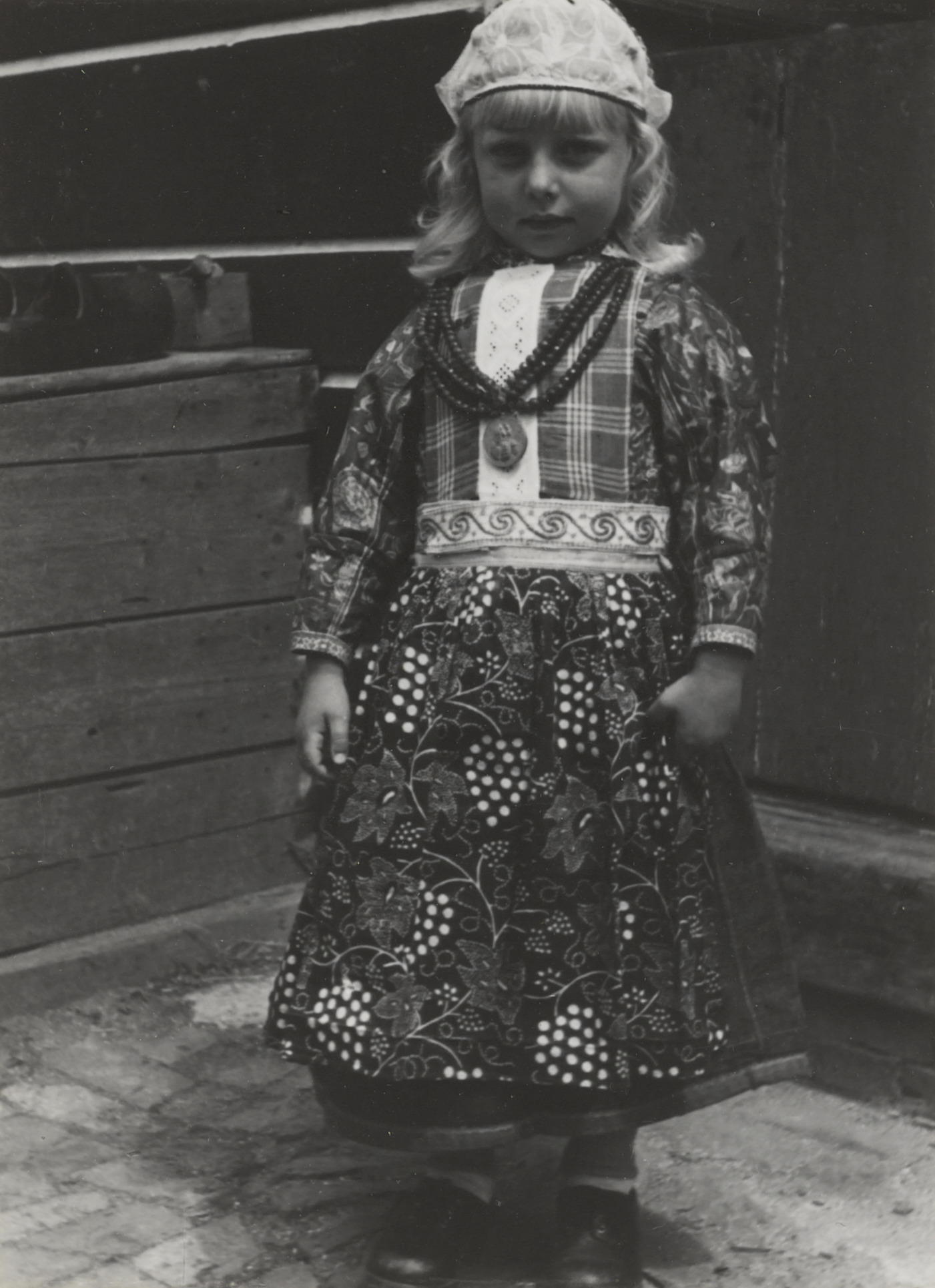 Pieter Schipper, gekleed in Marker streekdracht. Hij is nog geen 5 jaar oud en draagt de rokkendracht. Pieter is als jongen onder meer herkenbaar aan zijn gebloemde 'boezel' (schort) en zijn geruite borstlap met 'legger' (witte strook in de borstlap). Hij is gekleed in pinksterdracht. Om zijn hals draagt hij een penning aan een kralenketting, ...