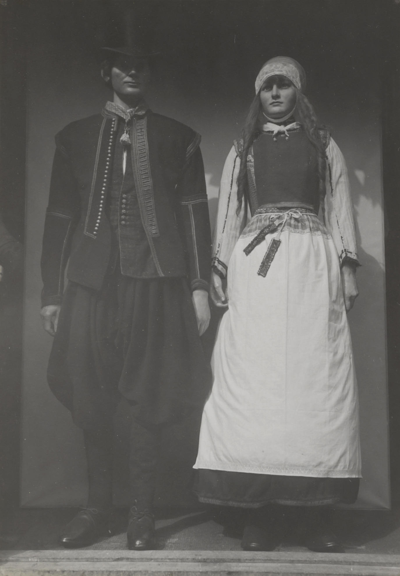 Twee poppen in Marker streekdracht, gefotografeerd tijdens de ontruiming van de streekdrachttentoonstelling in het Nederlands Openluchtmuseum vanwege de evacuatie van de museumcollectie in 1943. De pop links draagt de dracht voor bruiloftsgasten en Pinksteren, de pop rechts is gekleed als de 'schone kok'.