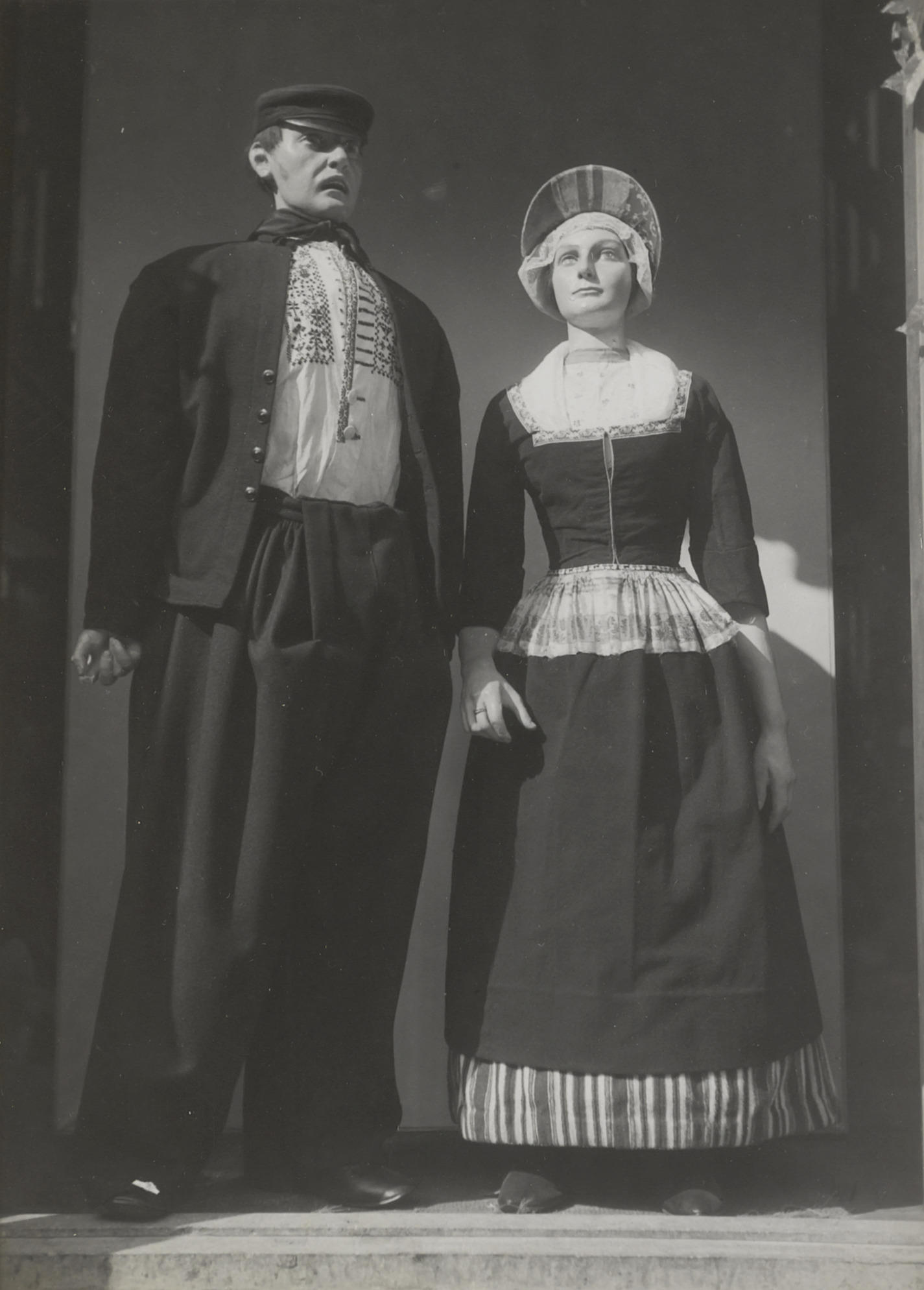 Twee poppen in Volendammer streekdracht, gefotografeerd tijdens de ontruiming van de streekdrachttentoonstelling in het Nederlands Openluchtmuseum vanwege de evacuatie van de museumcollectie in 1943. De pop links draagt de kleding van de 'visser op zondag', de pop rechts de kleding van de 'jonge vrouw op zondag'. De kralenketting van de vrouwenpop en de zilveren knopen ...