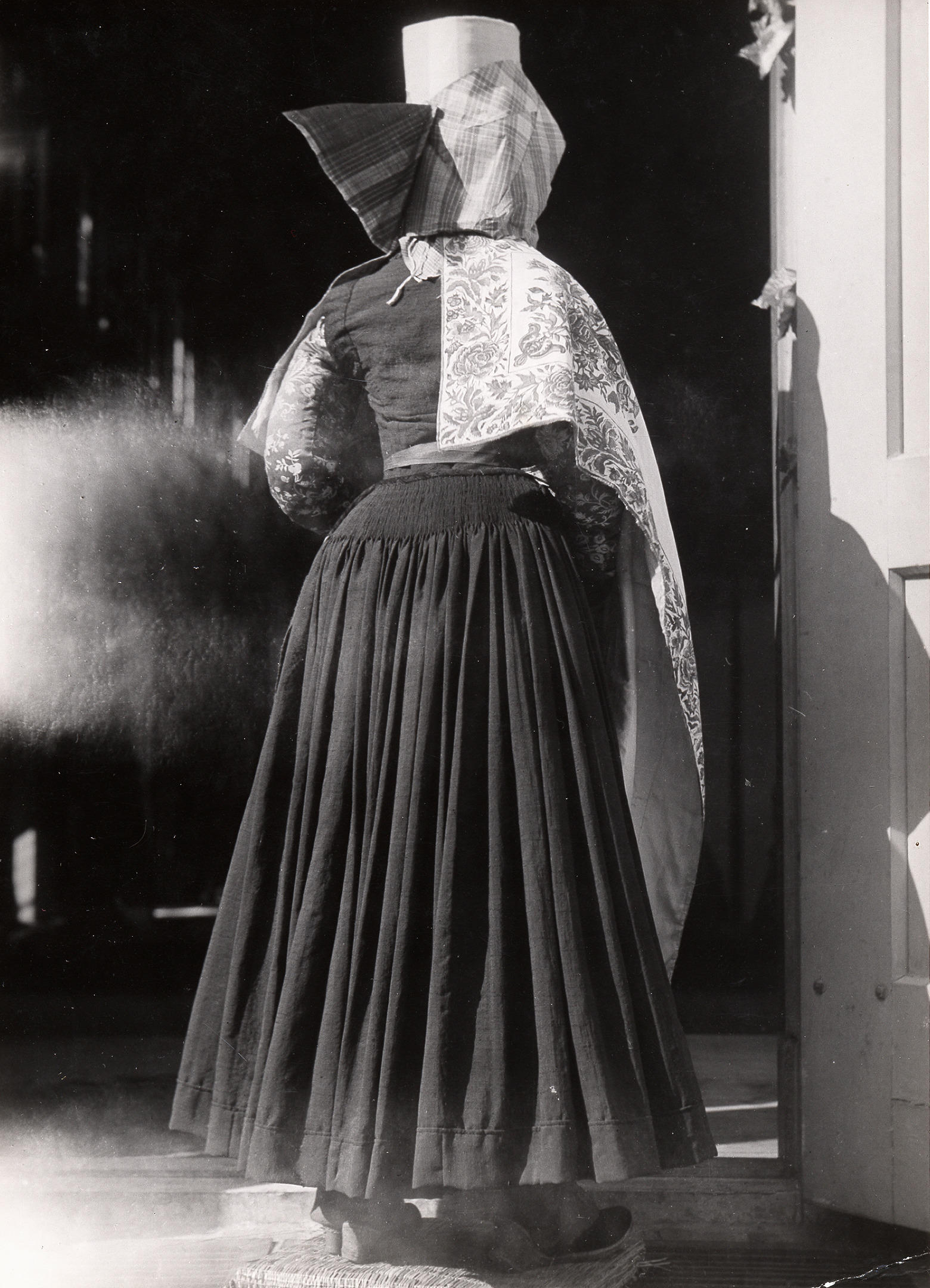 Pop in Hindelooper streekdracht, gefotografeerd tijdens de ontruiming van de streekdrachttentoonstelling in het Nederlands Openluchtmuseum vanwege de evacuatie van de museumcollectie in 1943. Deze Hindelooper pop maakte geen deel uit van de oorspronkelijke 1898-collectie.