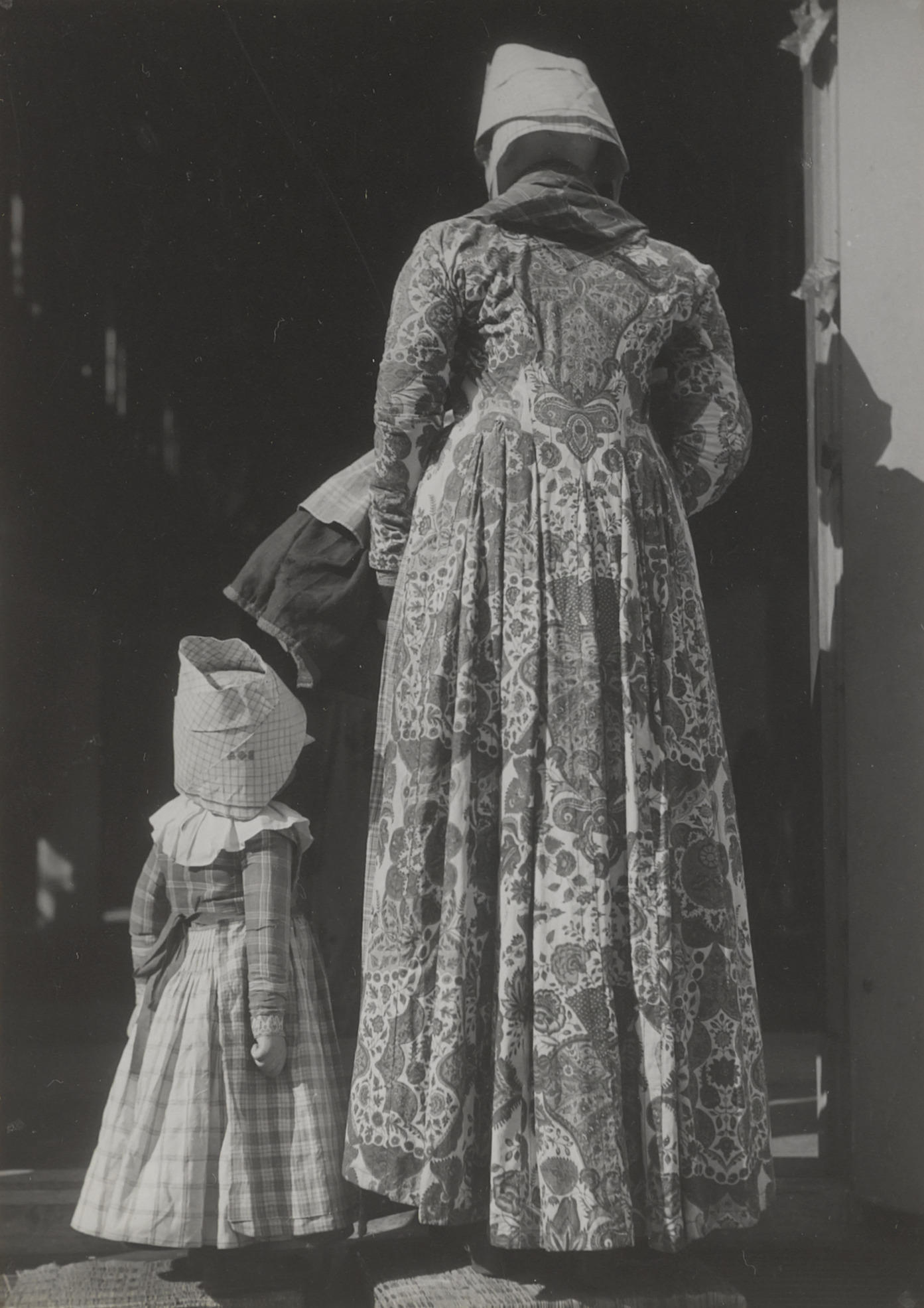 Drie poppen in Hindelooper streekdracht, gefotografeerd tijdens de ontruiming van de streekdrachttentoonstelling in het Nederlands Openluchtmuseum vanwege de evacuatie van de museumcollectie in 1943. Deze Hindelooper drachten maakten geen deel uit van de oorspronkelijke 1898-collectie.