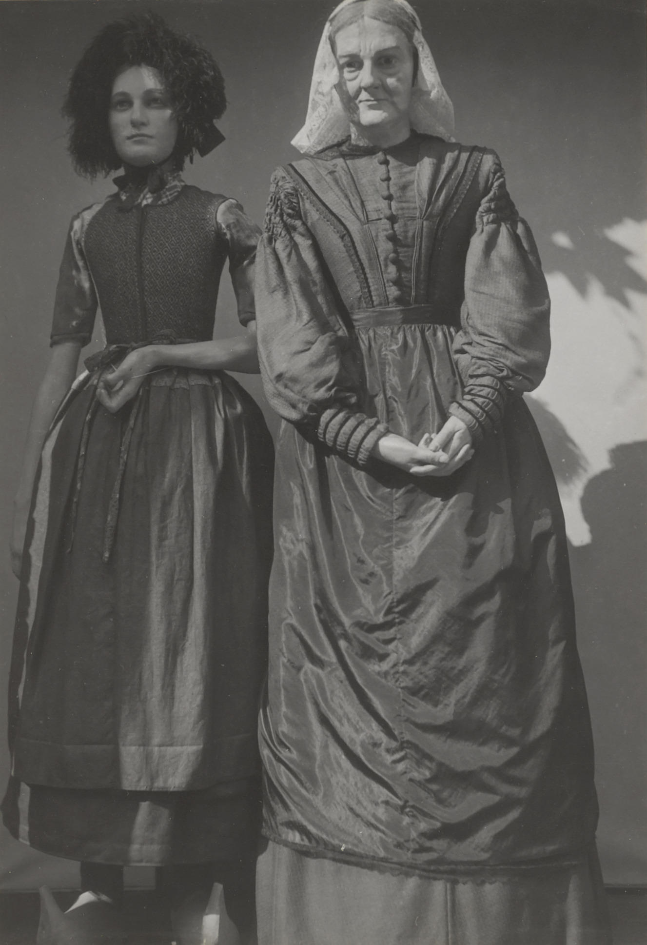 Twee poppen in streekdracht, gefotografeerd tijdens de ontruiming van de streekdrachttentoonstelling in het Nederlands Openluchtmuseum vanwege de evacuatie van de museumcollectie in 1943. De pop links draagt de dracht voor een meisje uit Stokkum, de pop rechts de dracht voor vrouwen uit Blaricum. Het oorijzer en de overige sieraden van de rechter pop zijn verwijderd ...