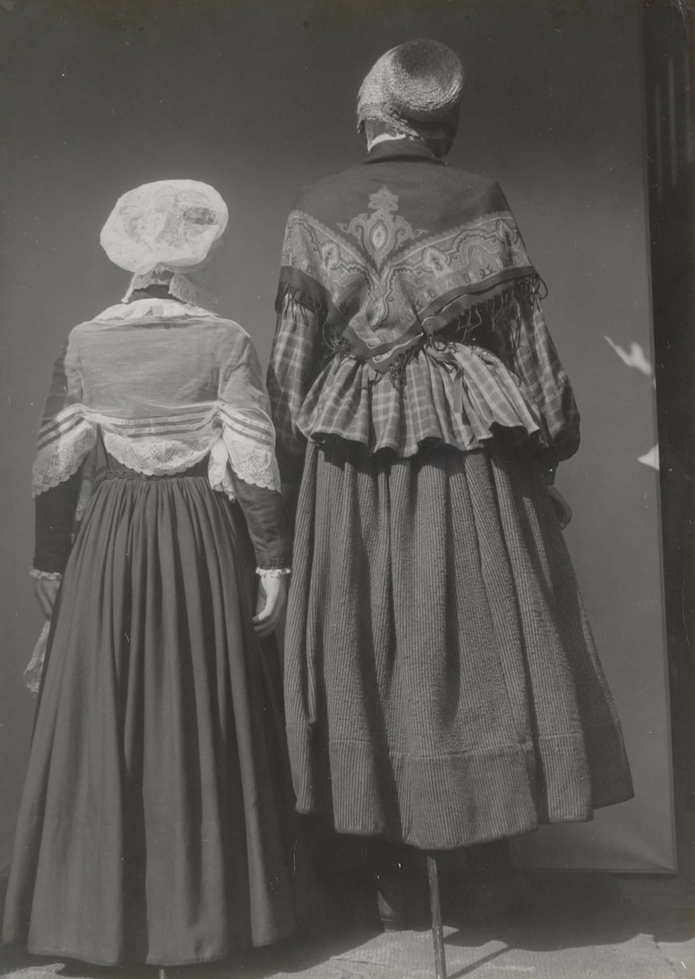 Twee poppen in streekdracht, gefotografeerd tijdens de ontruiming van de streekdrachttentoonstelling in het Nederlands Openluchtmuseum vanwege de evacuatie van de museumcollectie in 1943. De pop links draagt communiekleding uit het Markiezaat van Bergen op Zoom en de pop rechts kleding van een marktvrouw uit Maastricht.