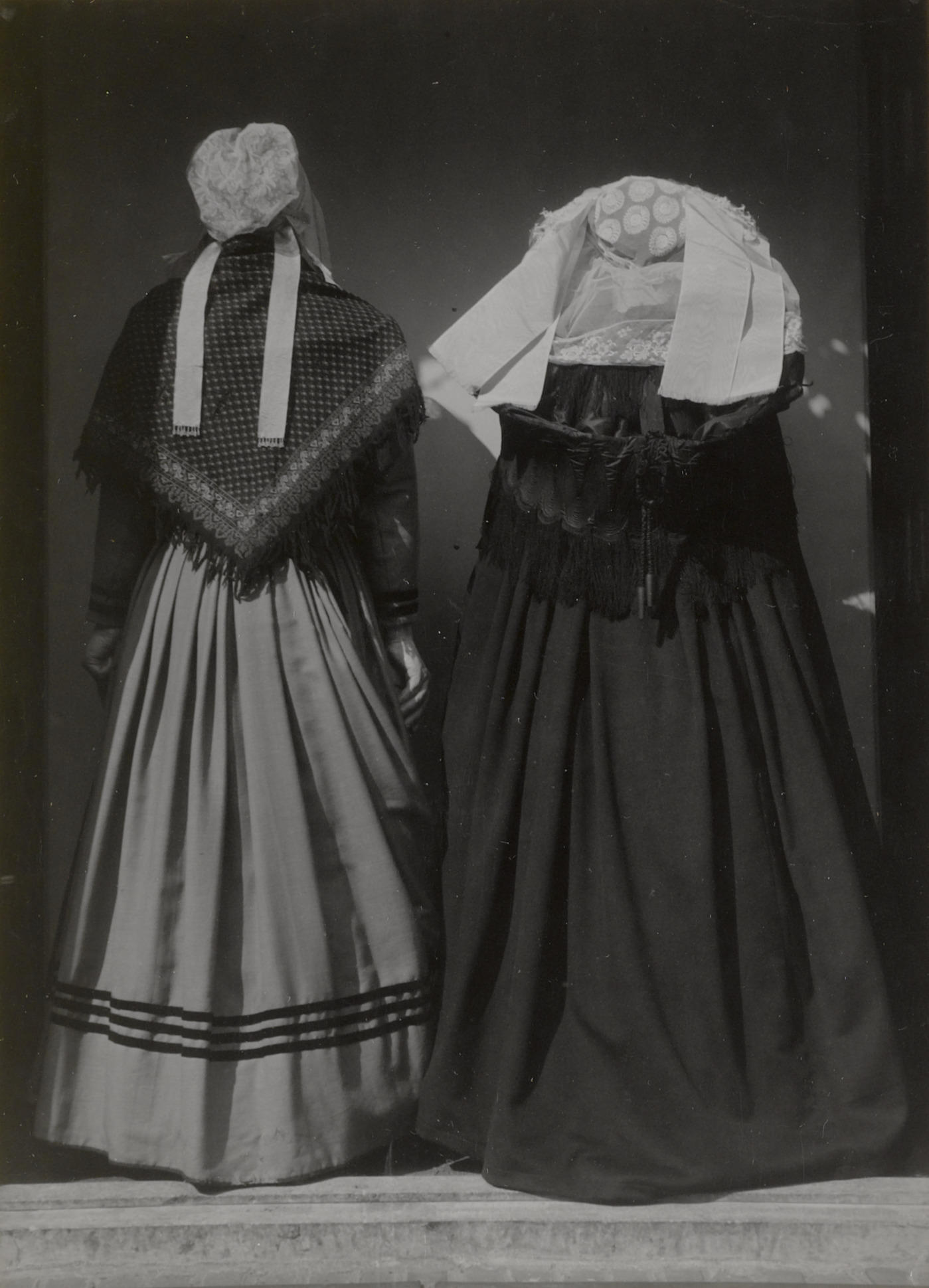 Twee poppen in streekdracht, gefotografeerd tijdens de ontruiming van de streekdrachttentoonstelling in het Nederlands Openluchtmuseum vanwege de evacuatie van de museumcollectie in 1943. De pop links draagt de dracht uit Ossendrecht en de pop rechts kleding uit de Meijerij van Den Bosch.