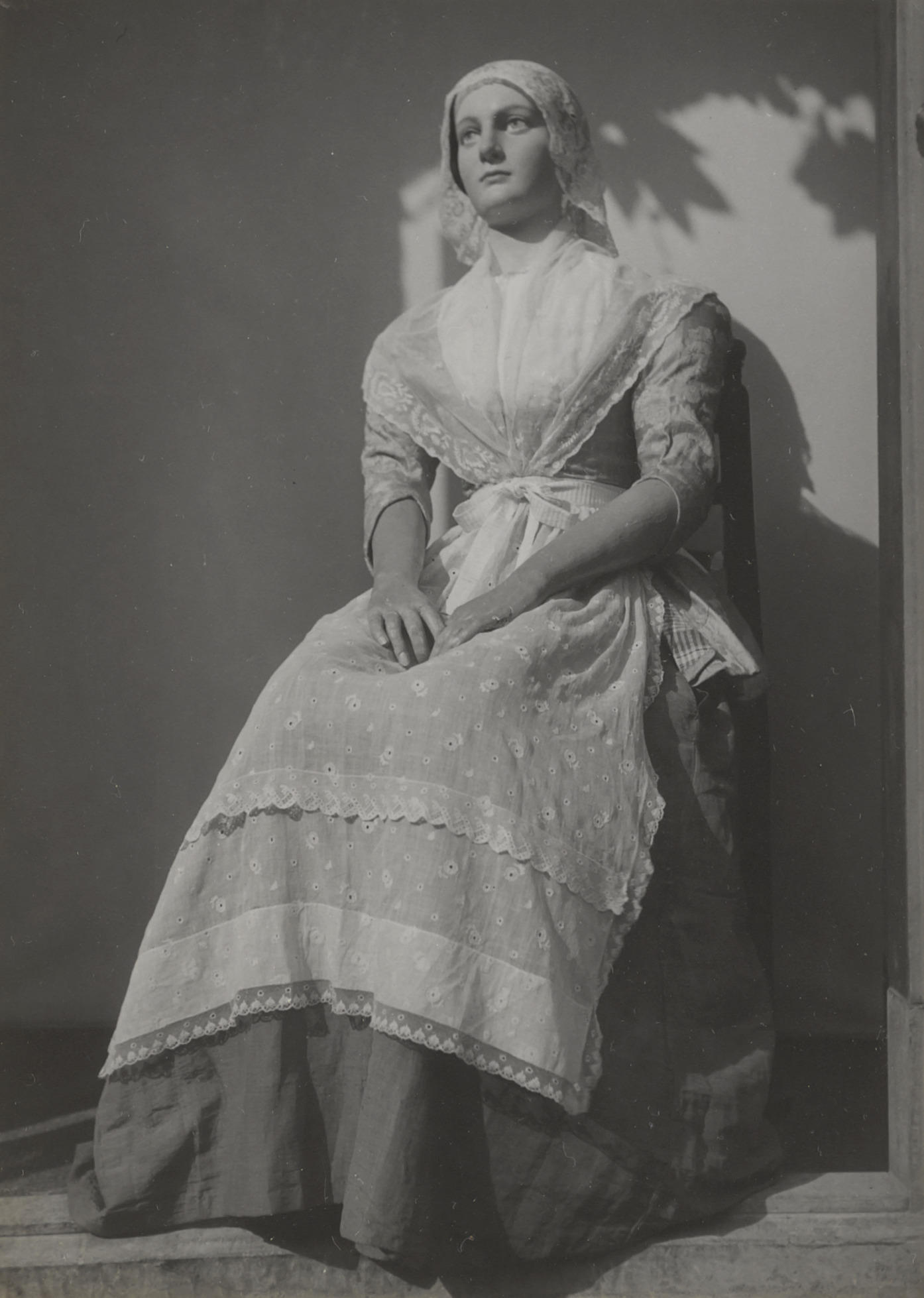 Pop in Friese streekdracht, gefotografeerd tijdens de ontruiming van de streekdrachttentoonstelling in het Nederlands Openluchtmuseum vanwege de evacuatie van de museumcollectie in 1943. Voor de evacuatie zijn onder meer het oorijzer, de voorhoofdsnaald en de beugeltas verwijderd.