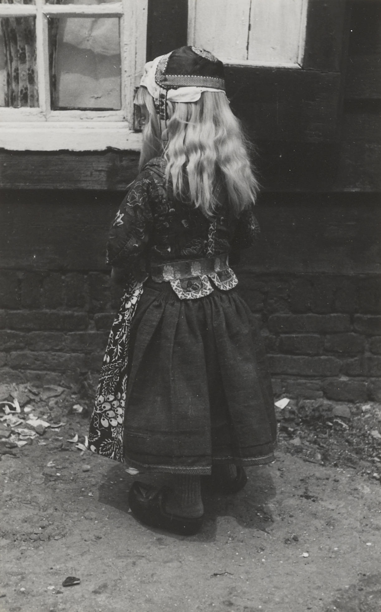 Jan van Brederode in Marker streekdracht. Hij is nog geen 5 jaar oud en draagt de rokkendracht. Jan is als jongen onder meer herkenbaar aan zijn gebloemde 'boezel' (schort), de twee pandjes aan de achterzijde van zijn 'borsik' (jak) en het model van zijn muts. Jan is gekleed in pinksterkleding, het zogenoemde Pinkster-bas.