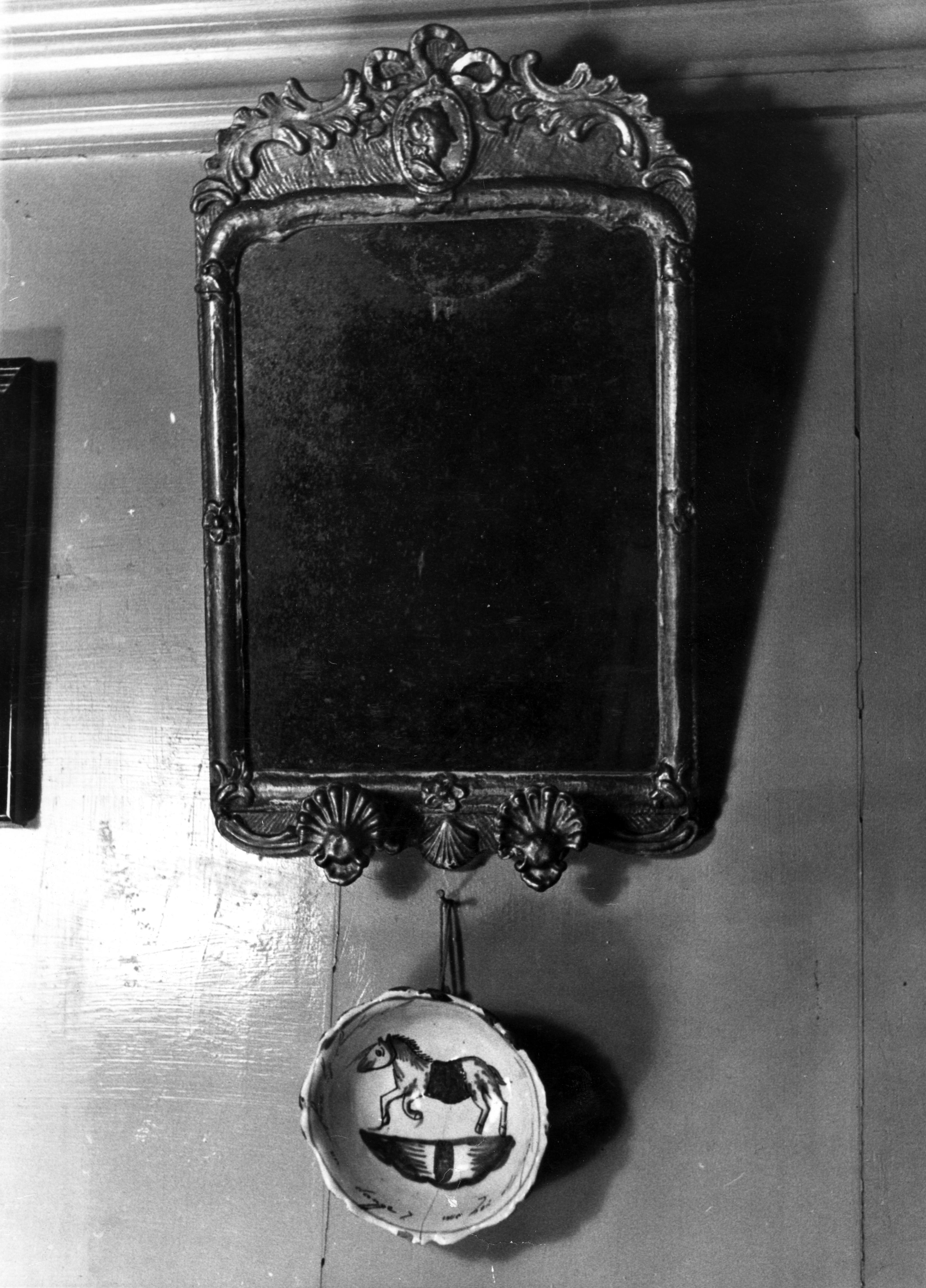Spiegel in een bewerkte lijst in een woning op Marken. Onder de spiegel hangt een wandbord met een afbeelding van een paard.