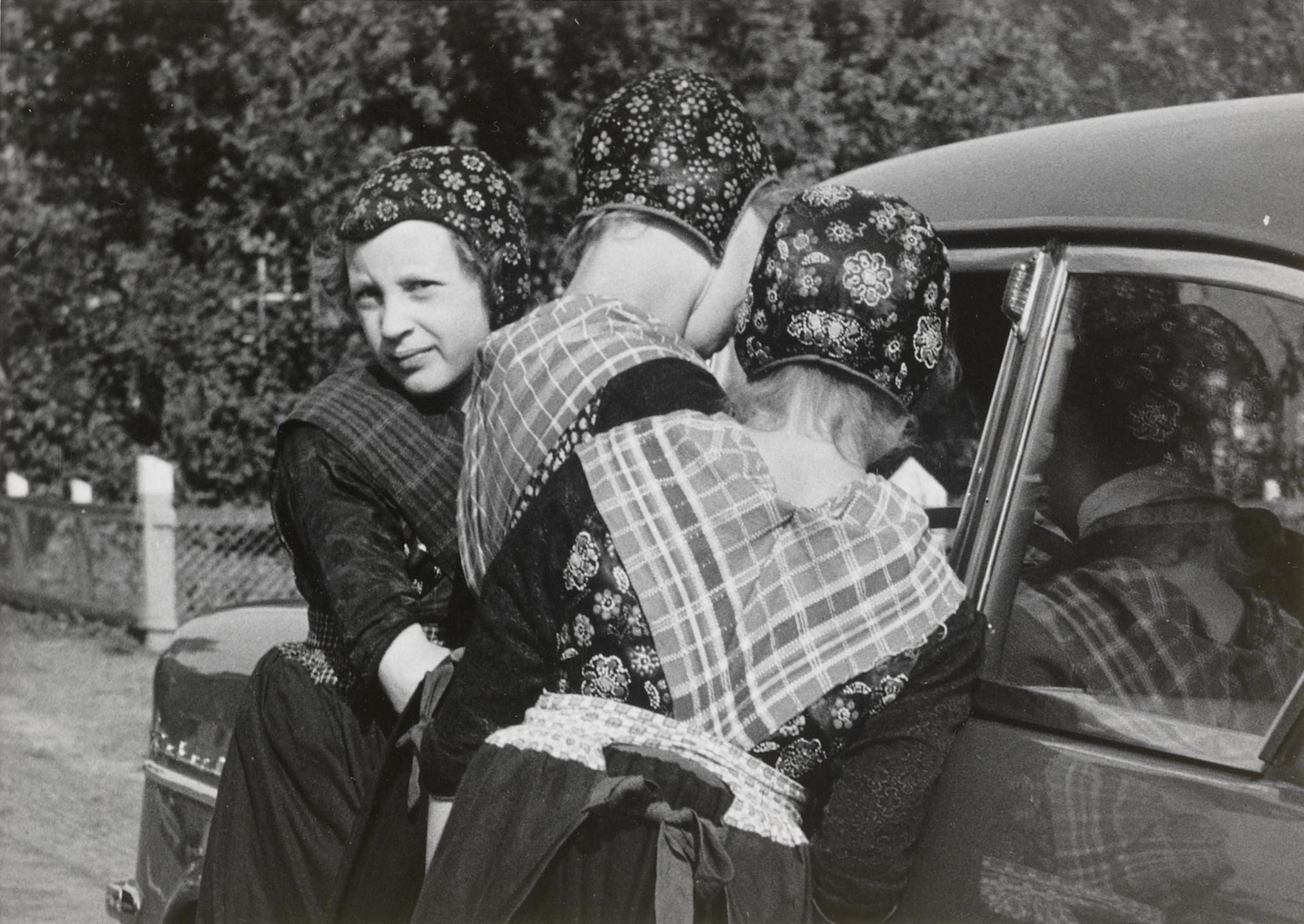 Drie meisjes in Staphorster streekdracht bij een auto. De meisjes zijn gekleed in daagse dracht. Het linker meisje, Beertje Timmerman, is in de rouw.