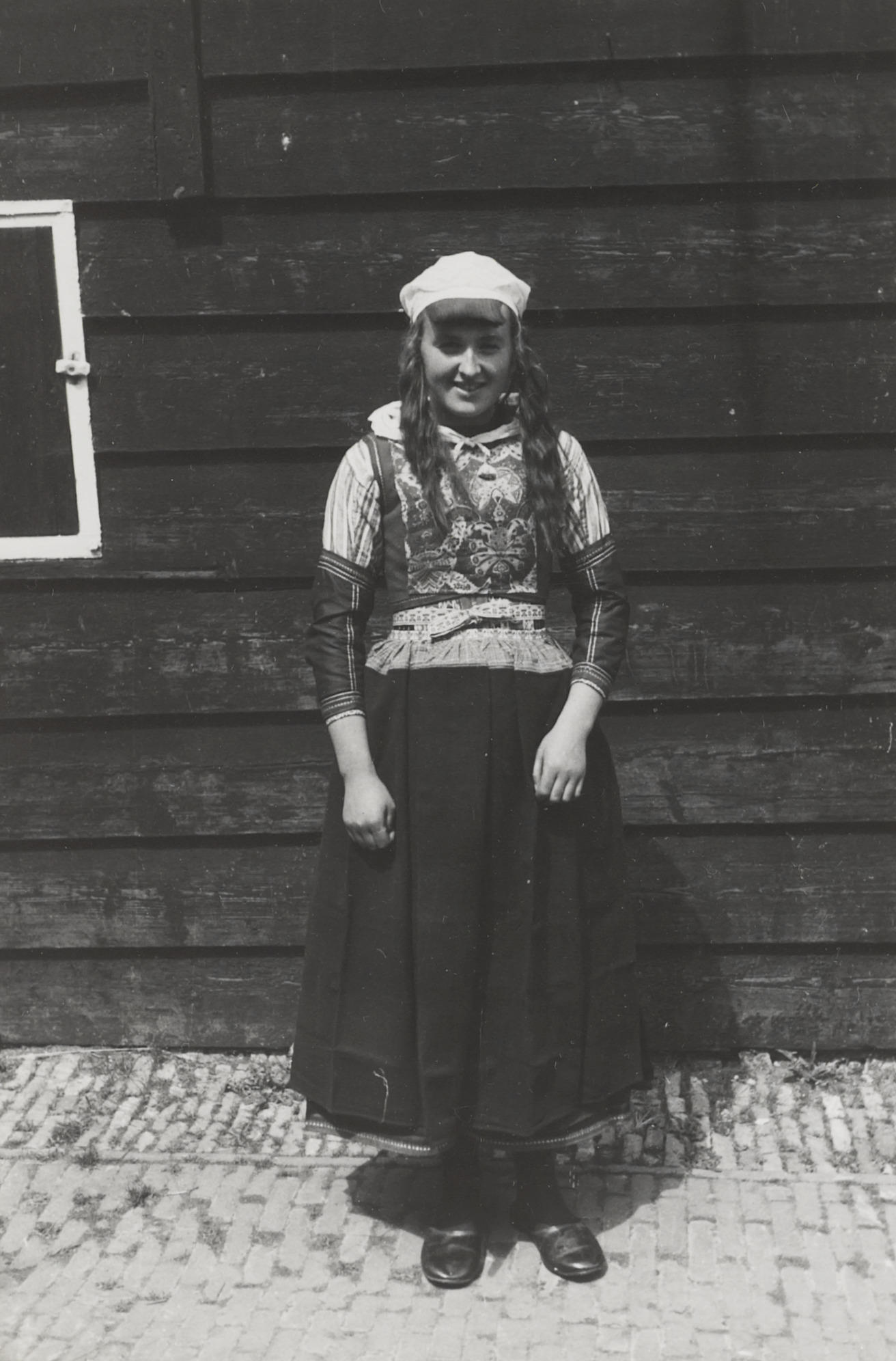 Lobberig Teerhuis in Marker streekdracht. Ze draagt kleding voor de Eerste Pinksterdag.