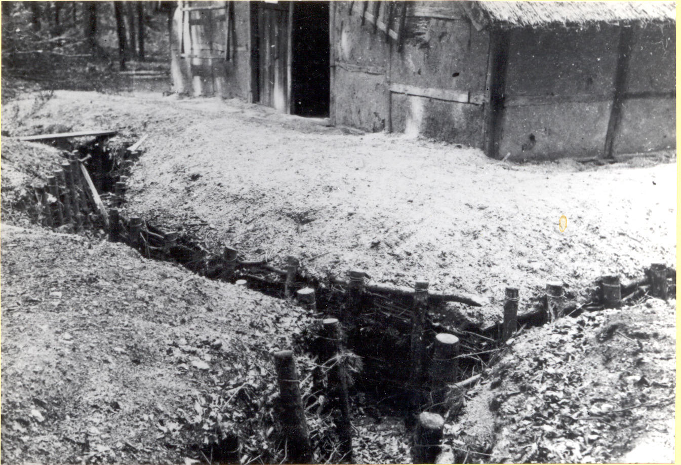 Loopgraven in het Nederlands Openluchtmuseum, 1945 (zwart-wit foto)