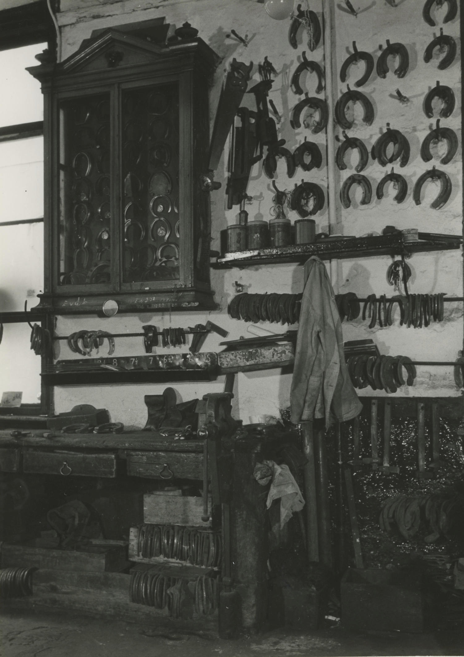 Muur met hoefijzers in het interieur van de hoefsmederij van Th. A. Poppe aan de Luttekestraat in Zwolle.