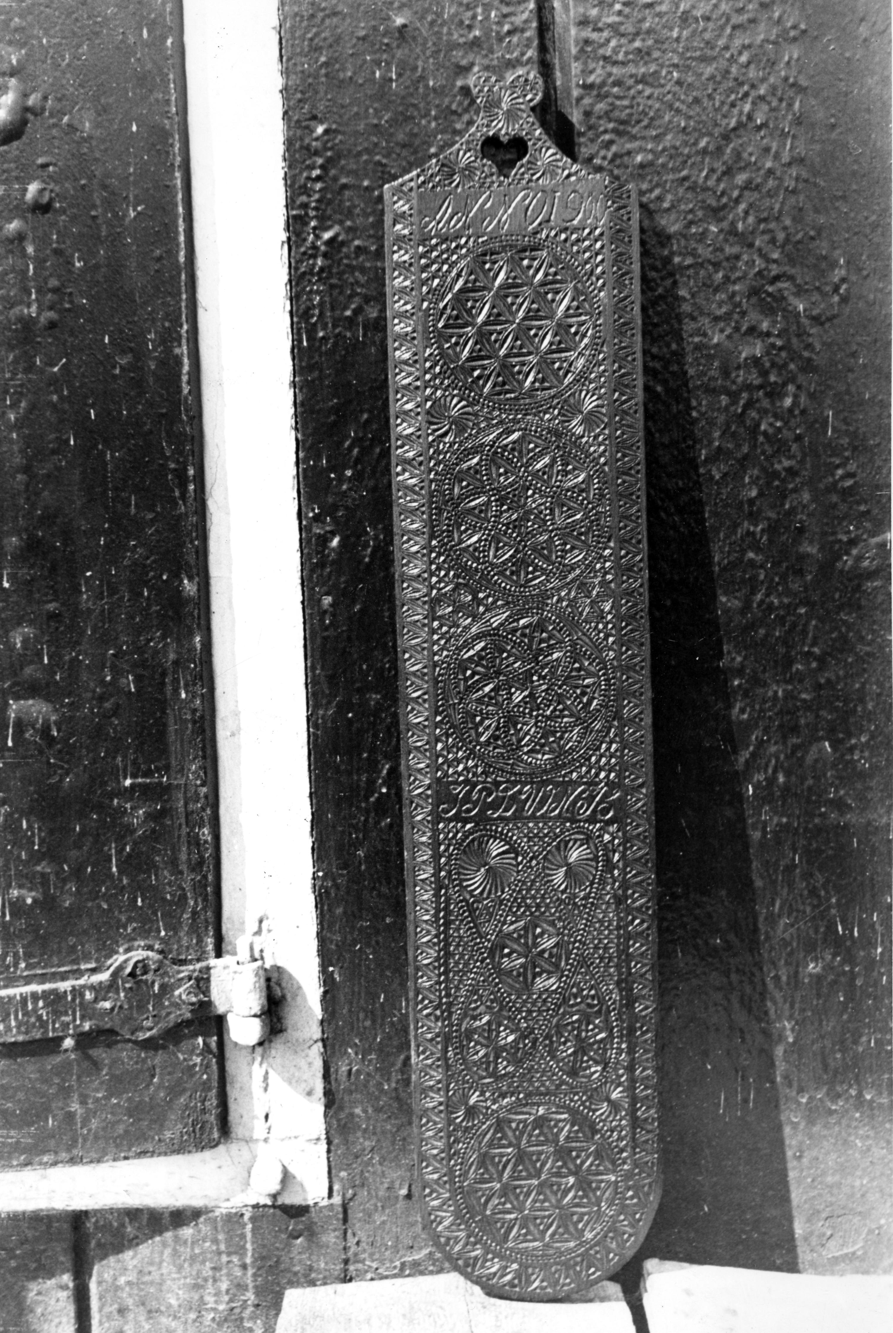 Mangelplank met kerfsnede en de datering 1900, gefotografeerd op Marken.