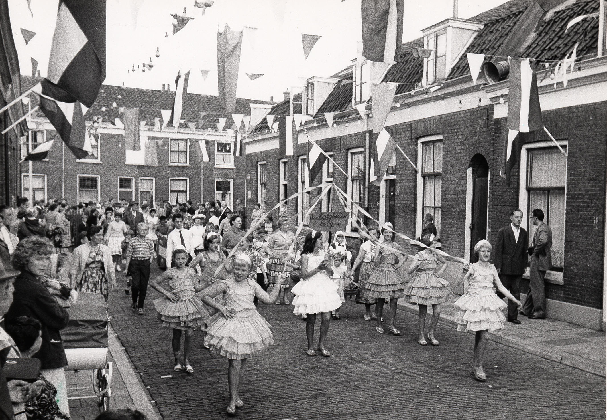 Meisjes formeren een 'Margrietboom' in een optocht tijdens een straatfeest in de Sluisstraat in Utrecht. Dit straatfeest werd gehouden op 20 augustus 1960.