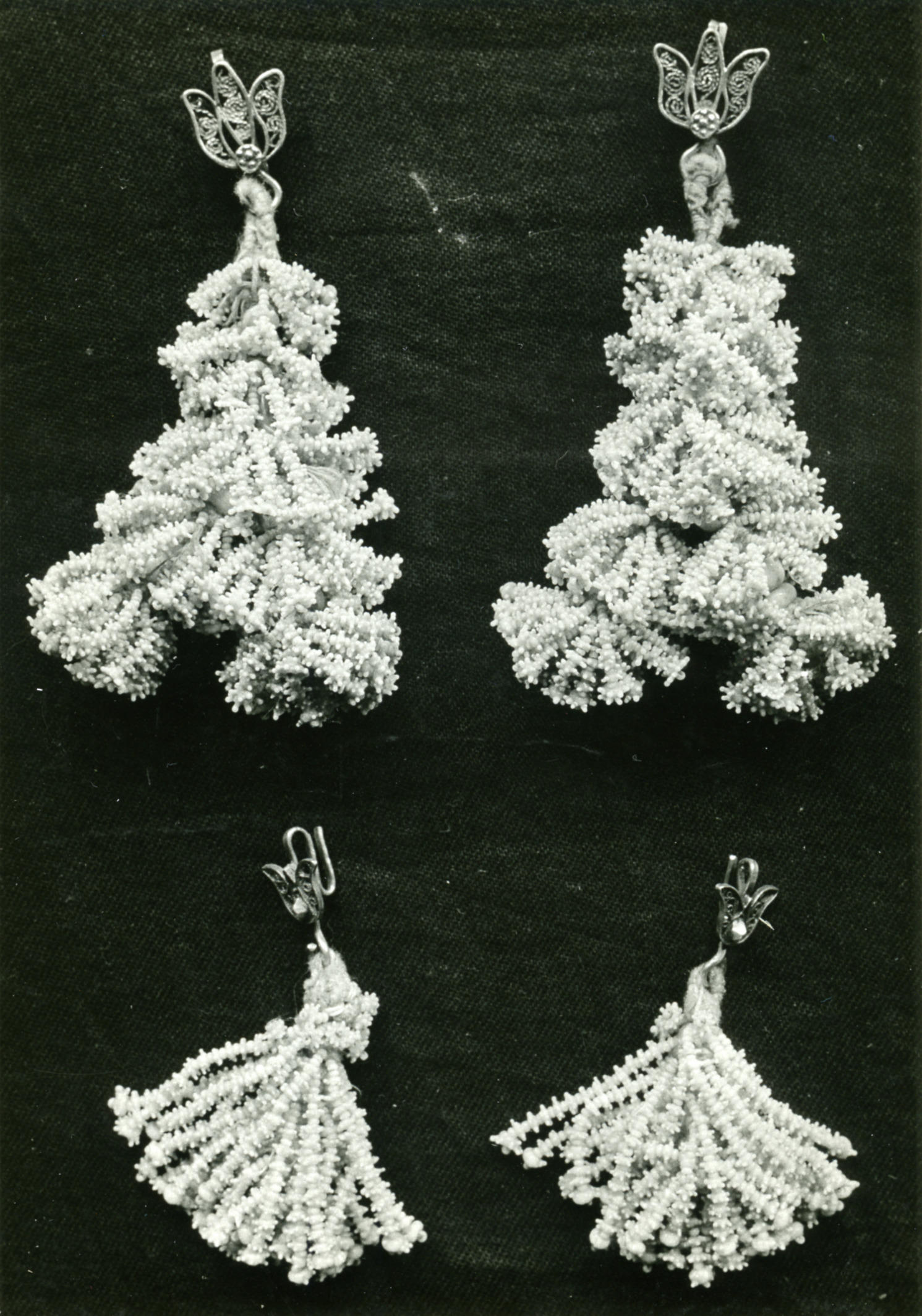 Twee paar zogenoemde bruidsakertjes, gedragen door een bruid in streekdracht van het eiland Marken. De akertjes zijn geknoopt van fijn garen en worden met een zogenoemd akerhaakje aan de punten van de schouderdoek gehangen.