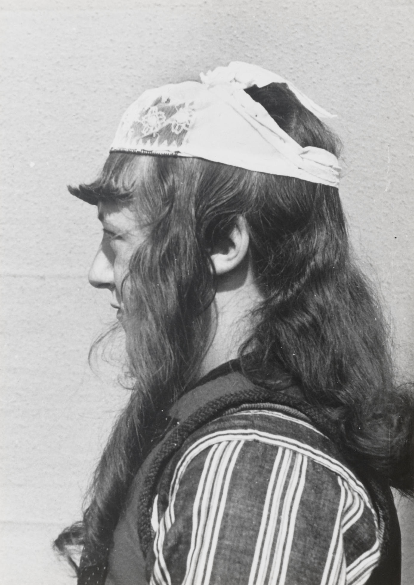 Demonstratie van het opzetten van de 'kleine kap' voor de zware rouw door Lobberig Kes. Eerst wordt de pony iets omhoog gekruld en een deel van het (lange) haar in twee pijpenkrullen langs het gezicht gedraaid. De rest van het haar wordt naar achteren gekamd. Over het haar komt de 'onderhul', een driehoekige witte lap, ...