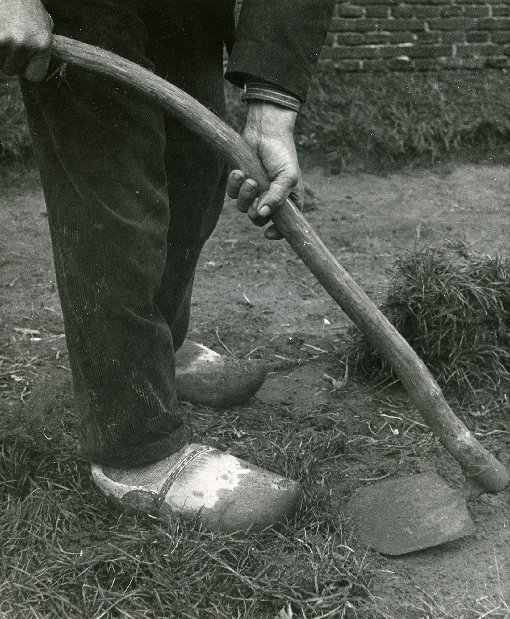 Demonsteren van het gebruik van een 'hakke', Lievelde, 1943 (zwart-wit foto)