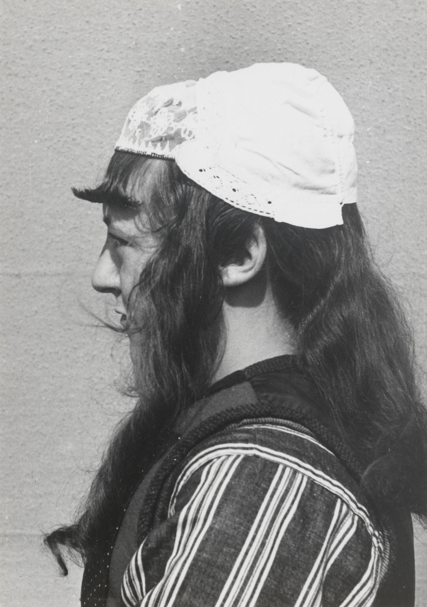 Demonstratie van het opzetten van de 'kleine kap' voor de zware rouw door Lobberig Kes. Eerst wordt de pony iets omhoog gekruld en een deel van het (lange) haar in twee pijpenkrullen langs het gezicht gedraaid. De rest van het haar wordt naar achteren gekamd. Over het haar komt de 'onderhul', een driehoekige witte lap, ...