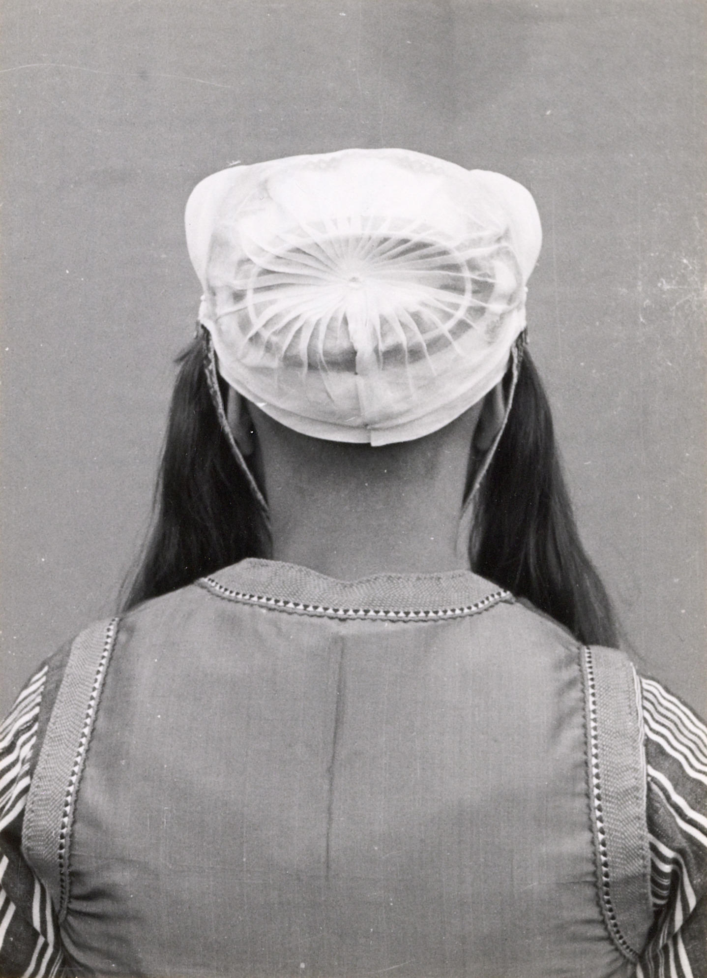 Demonstratie van het opzetten van de 'grote kap' door Luutje Stoker. Het haar wordt verdeeld in twee pijpenkrullen en een pony. In de nek is het haar opgeschoren. Over het haar is een witte ondermuts geplaatst. Over de ondermuts is de zogenoemde brief gespeld. Dit is een halvemaanvormig stuk bordpapier dat met een wollen band ...