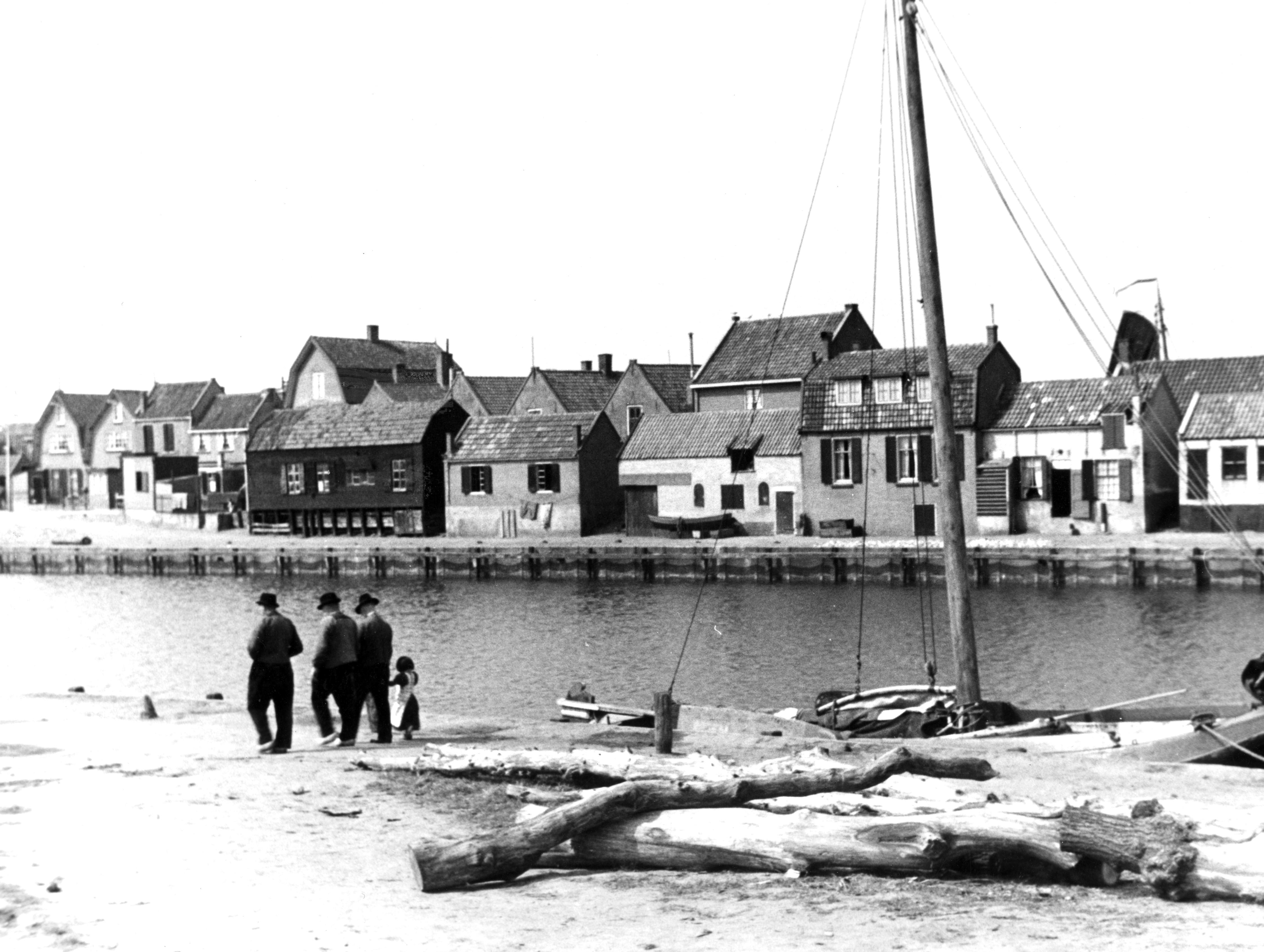 Haven met visserswoningen in Spakenburg. Op de voorgrond lopen drie mannen en een meisje. Het meisje is gekleed in Spakenburger dracht.