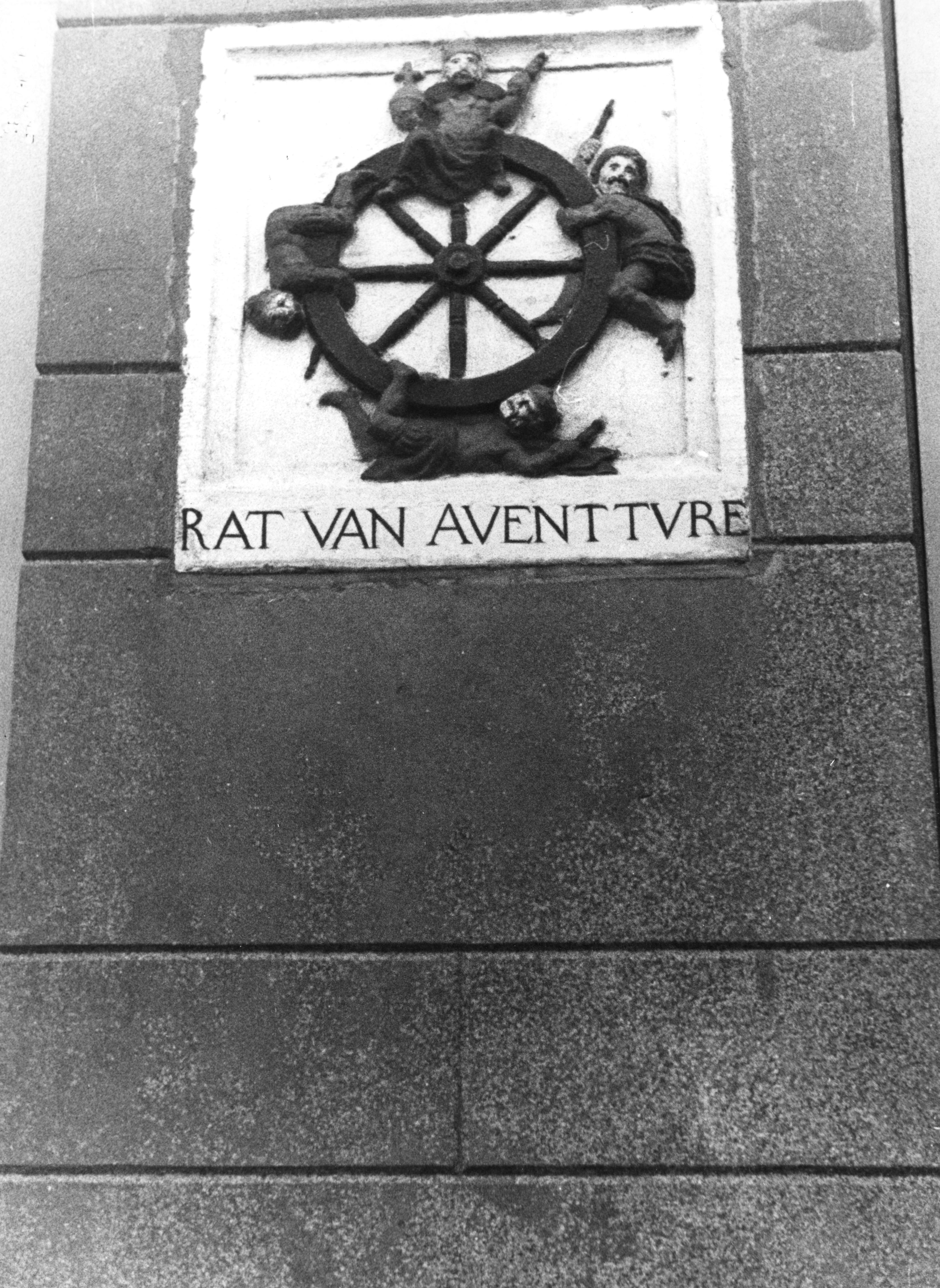 Gevelsteen met een voorstelling van het rad van avontuur en de tekst :'rat van aventture' in een gevel aan de Prinsengracht 3 in Enkhuizen.