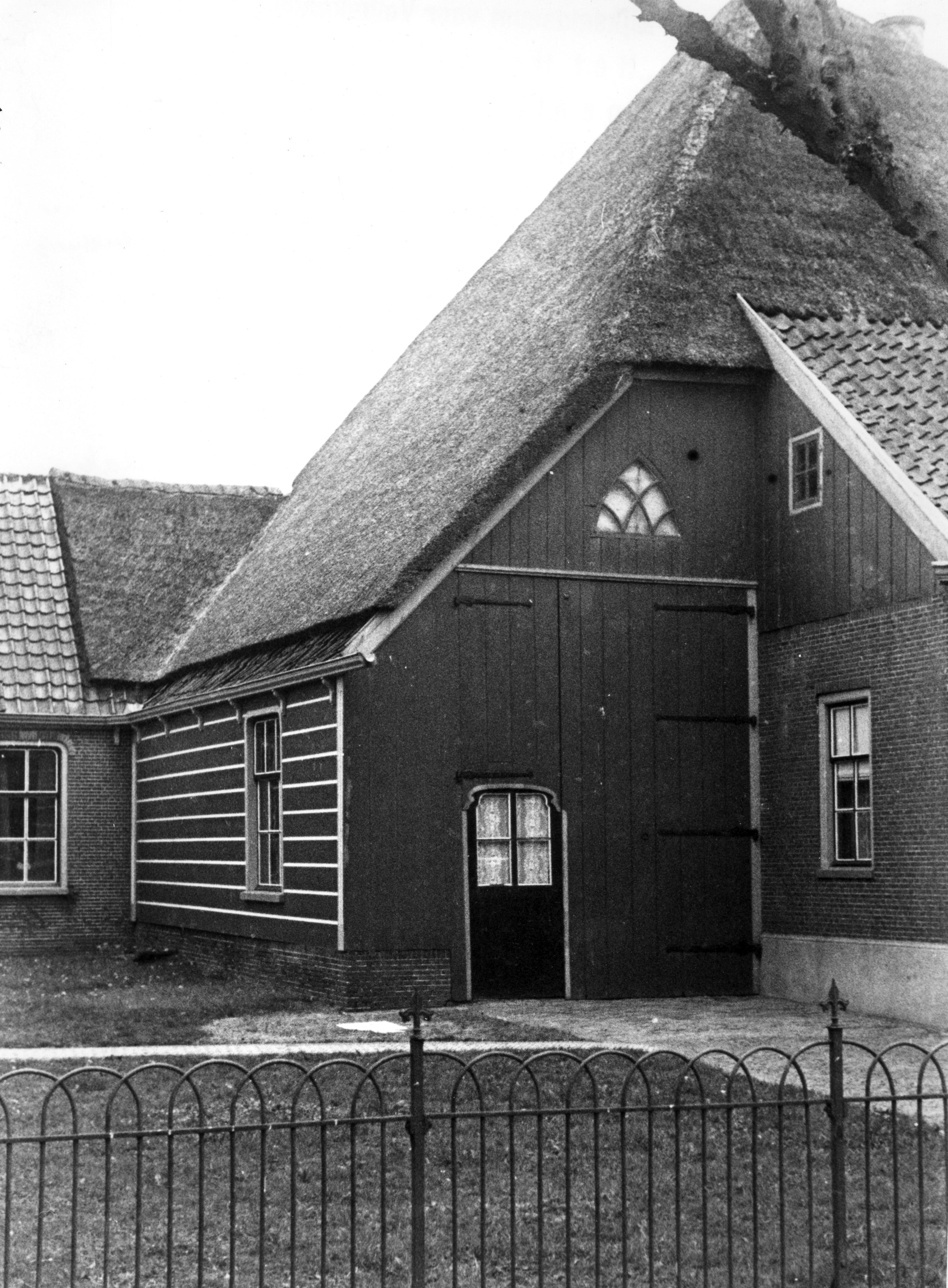 Noord-Hollandse stolpboerderij in Westwoud. De boerderij is deels met riet en deels met dakpannen gedekt. De wanden zijn deels van steen en deels van hout.