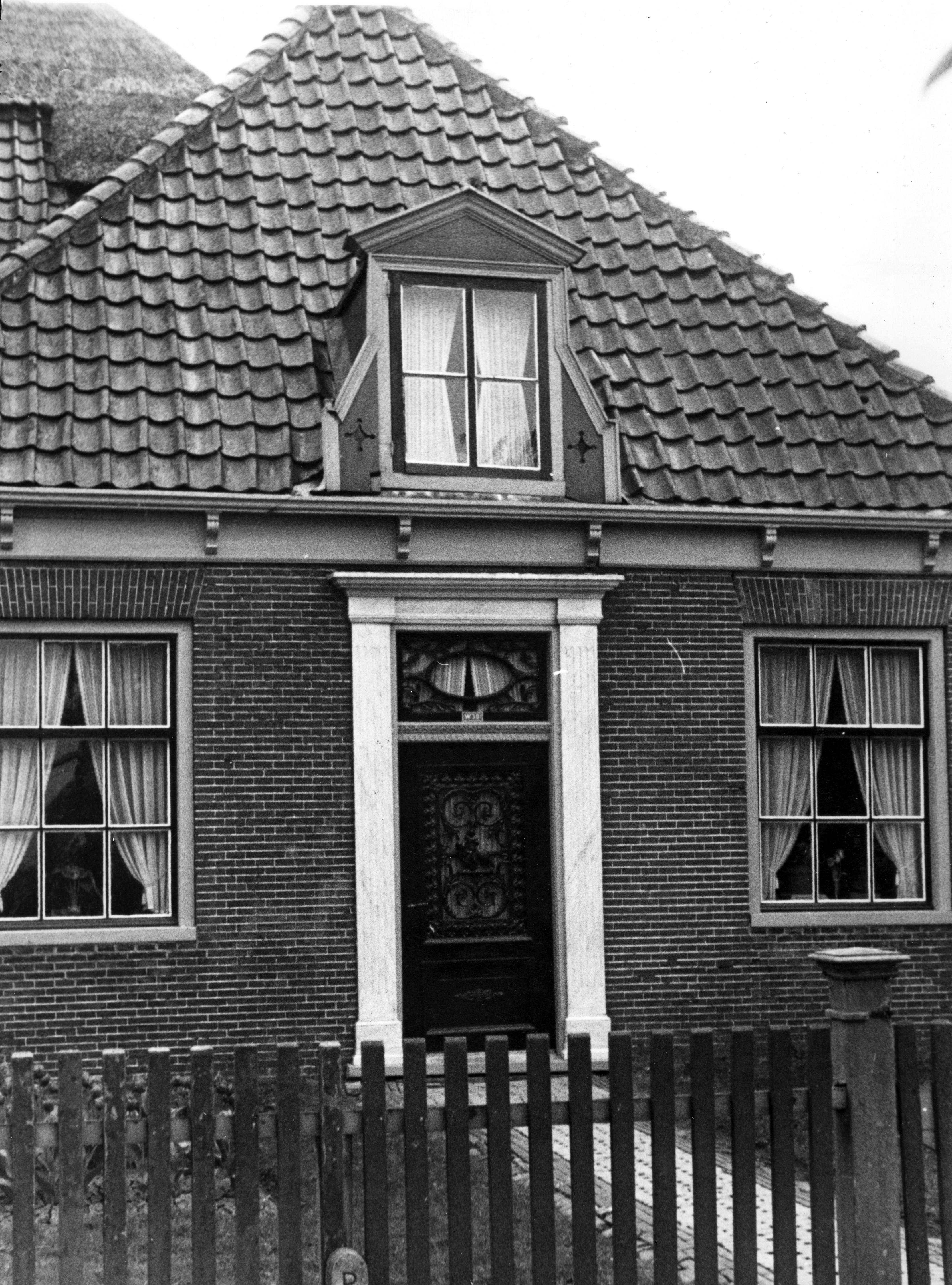 Voorgevel van het woongedeelte van een Noord-Hollandse stolpboerderij in Westwoud. In het bovenlicht zit een gietijzeren ornament. In de deur is tevens een gietijzeren ornament geplaatst.