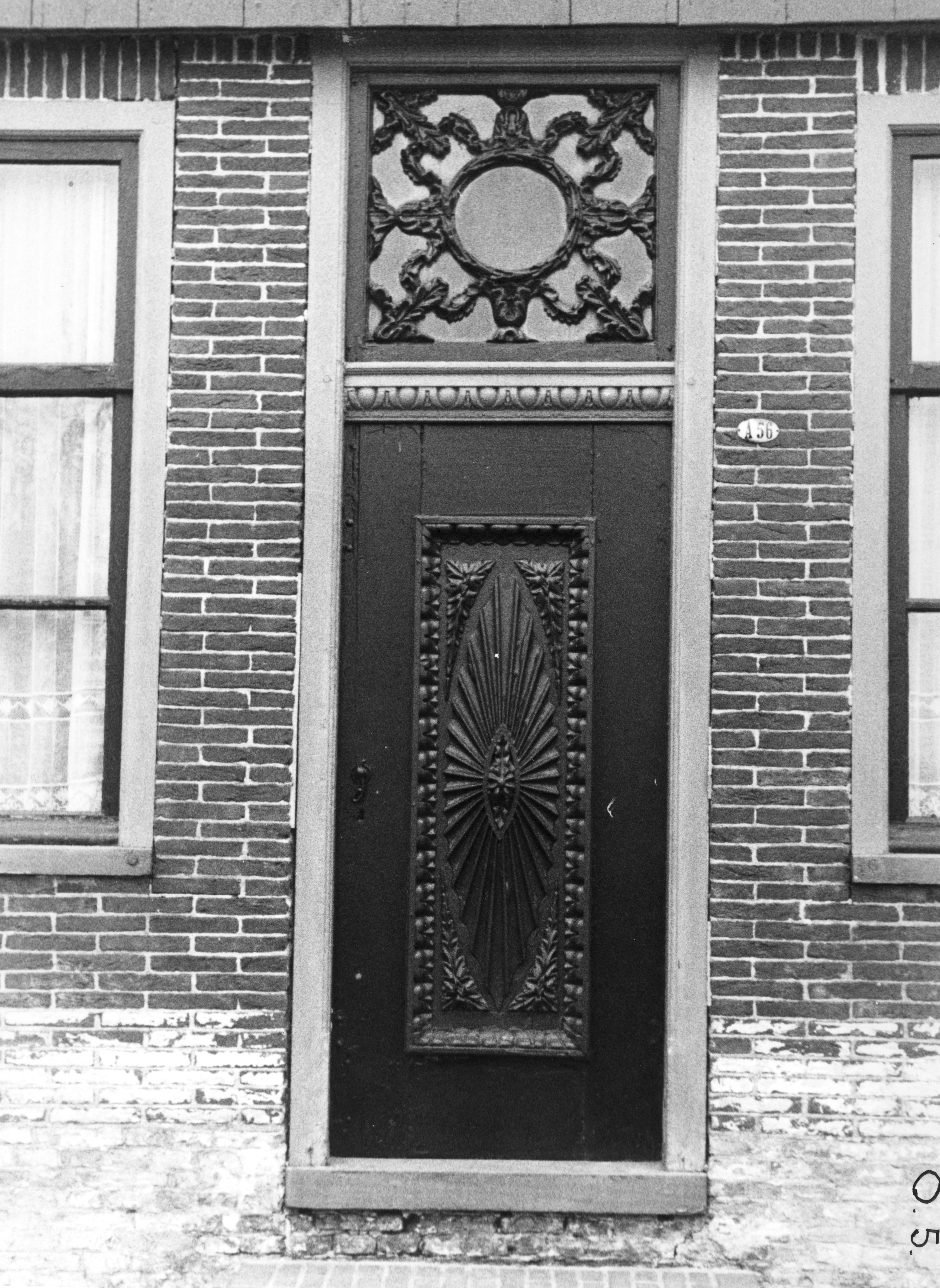 Deur met bovenlicht van een stolpboerderij in Oosterblokker. De deur is voorzien van een paneel met houtsnijwerk.