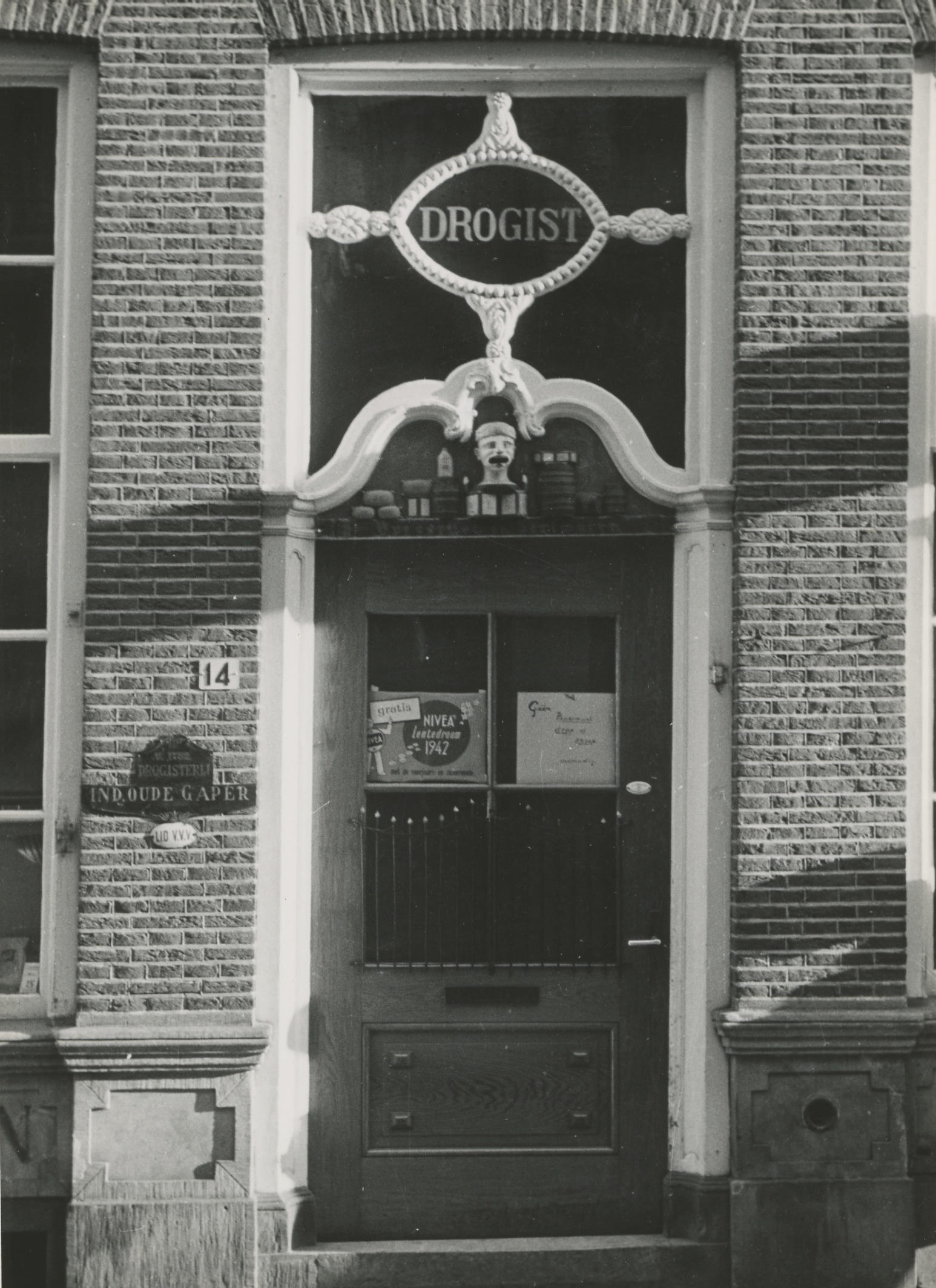 Deur van drogisterij 'De Oude Gaper', Zwolle, 1942 (zwart-wit foto)