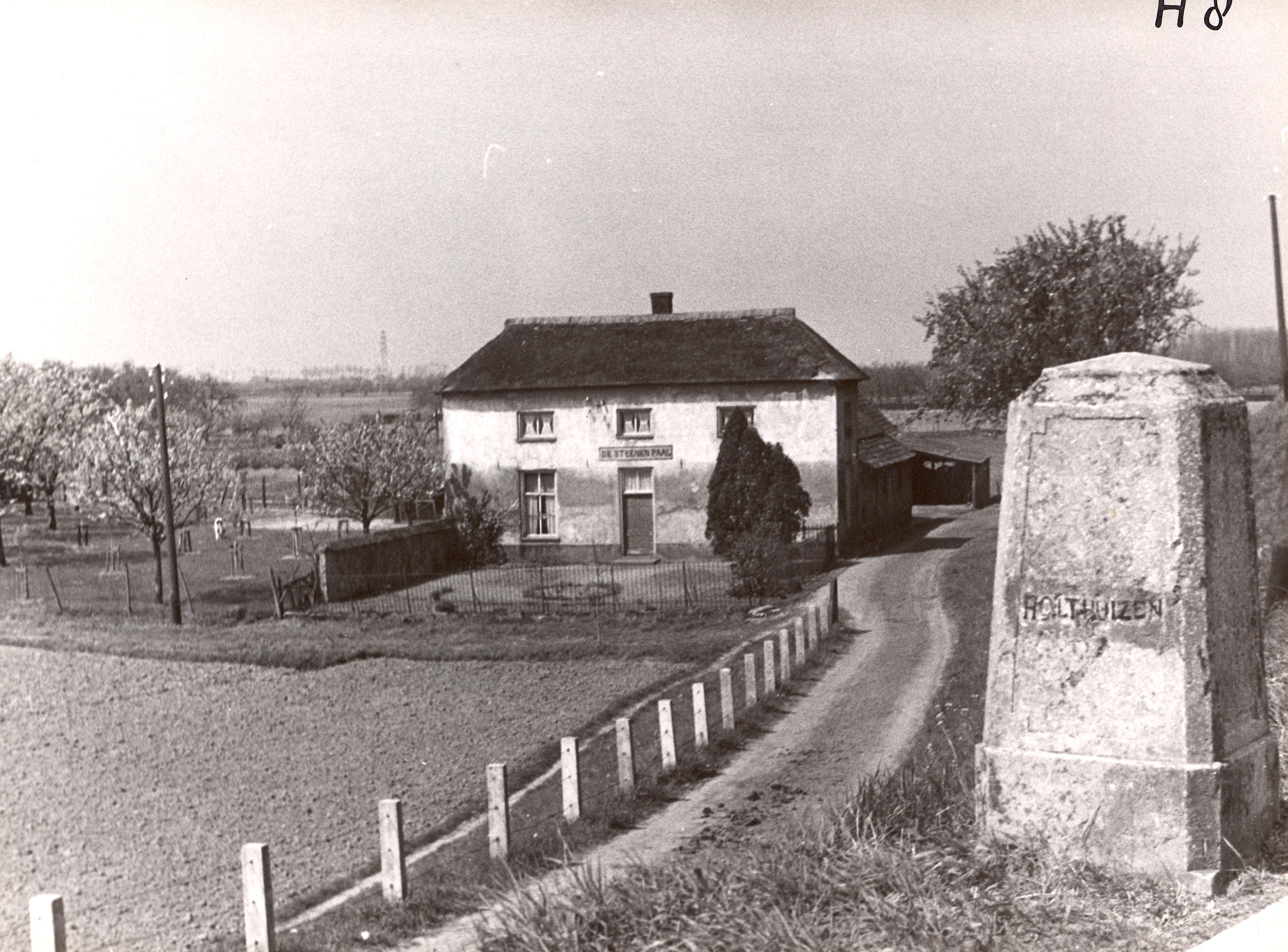 Boerderij 'De Steenen Paal' aan de Huissensedijk bij Huissen. Boven de deur in de voorgevel staat de naam van de boerderij. Rechts staat de grenspaal Huissen-Holthuizen.