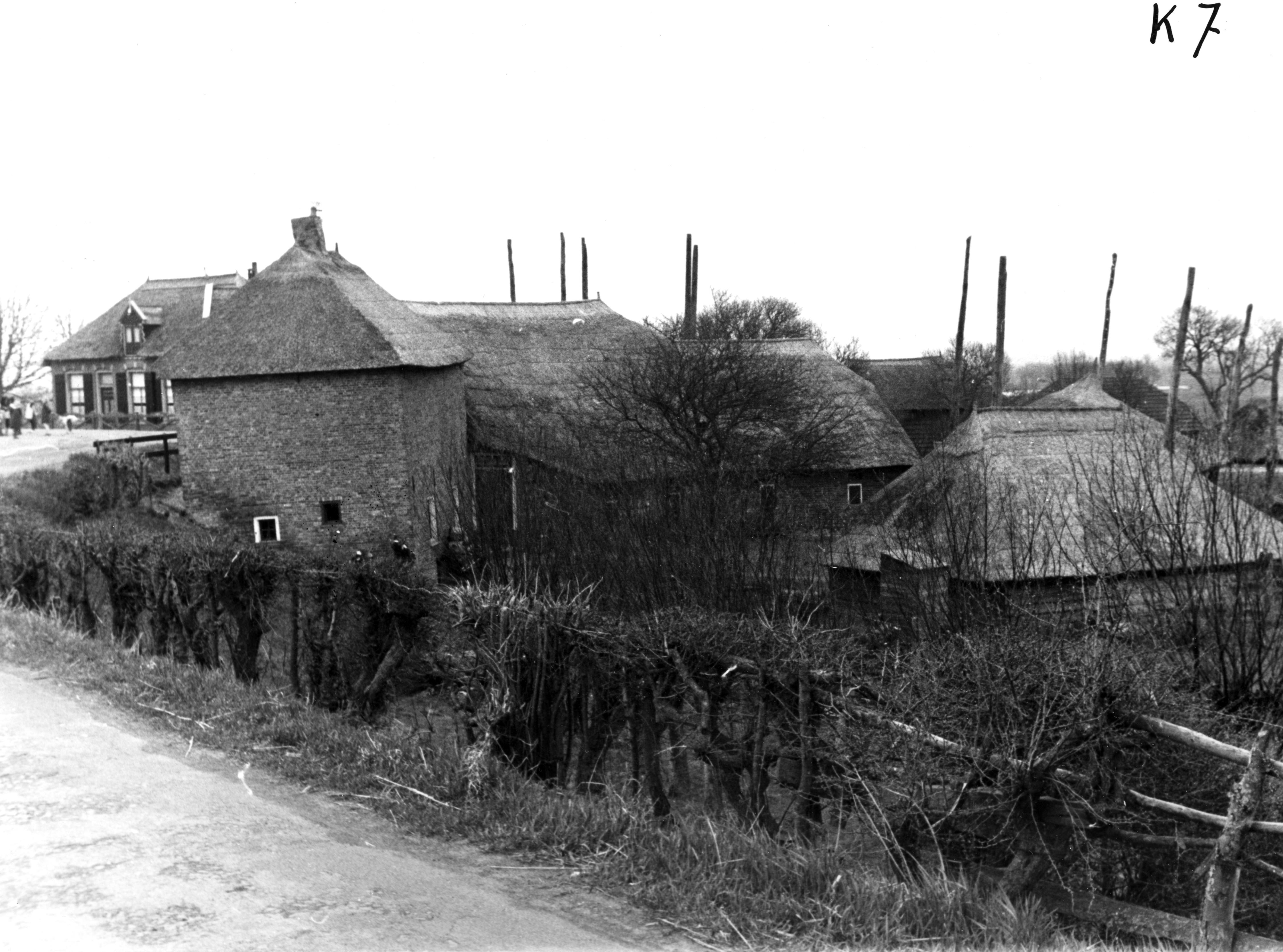 Boerderijen en hooibergen, Kamperzeedijk, 1942 (zwart-wit negatief)