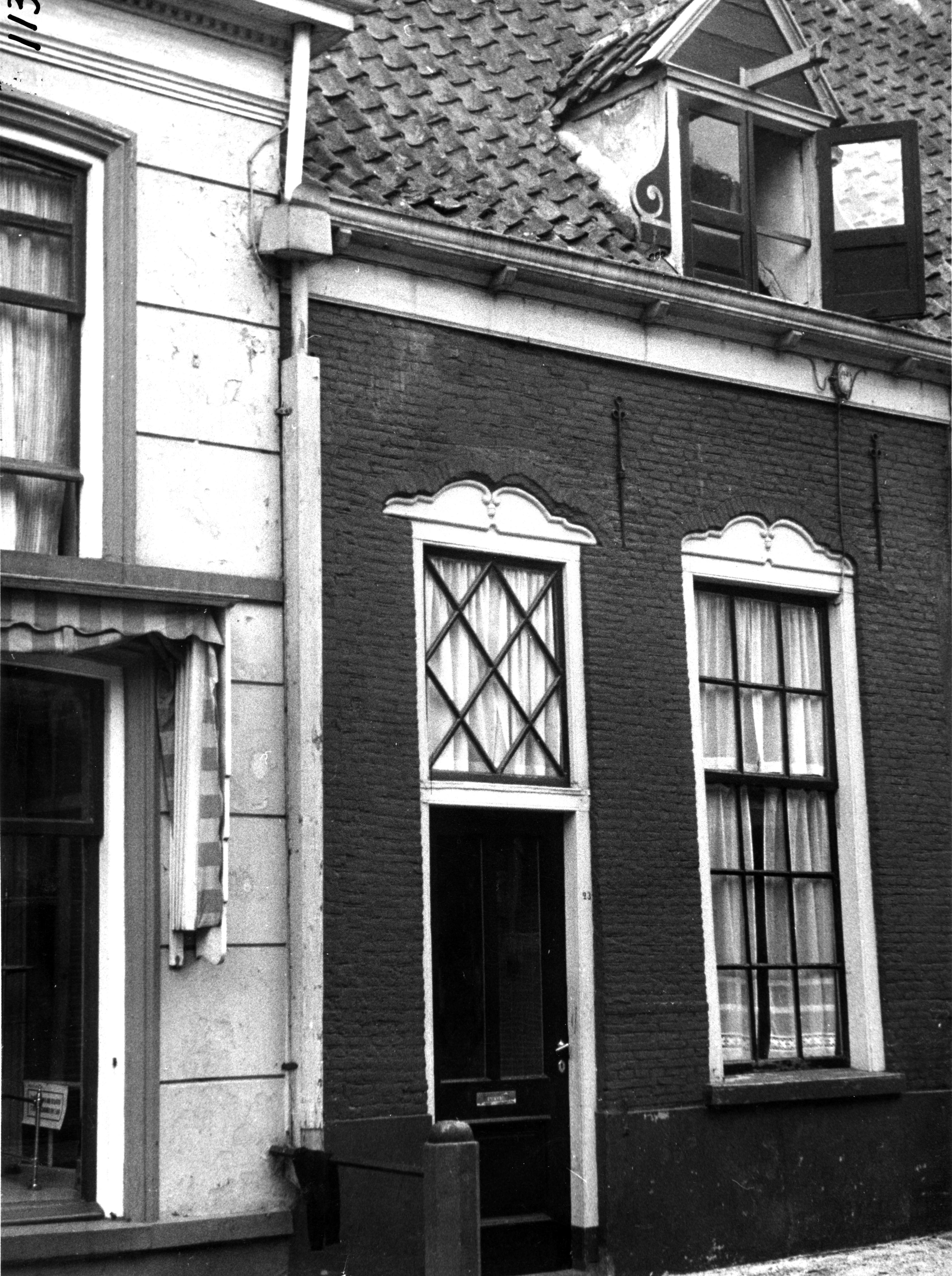 Gevel in Elburg. Boven de deur en het raam zit een bewerkte bekroning. Boven de deur is een bewerkt bovenlicht te zien.