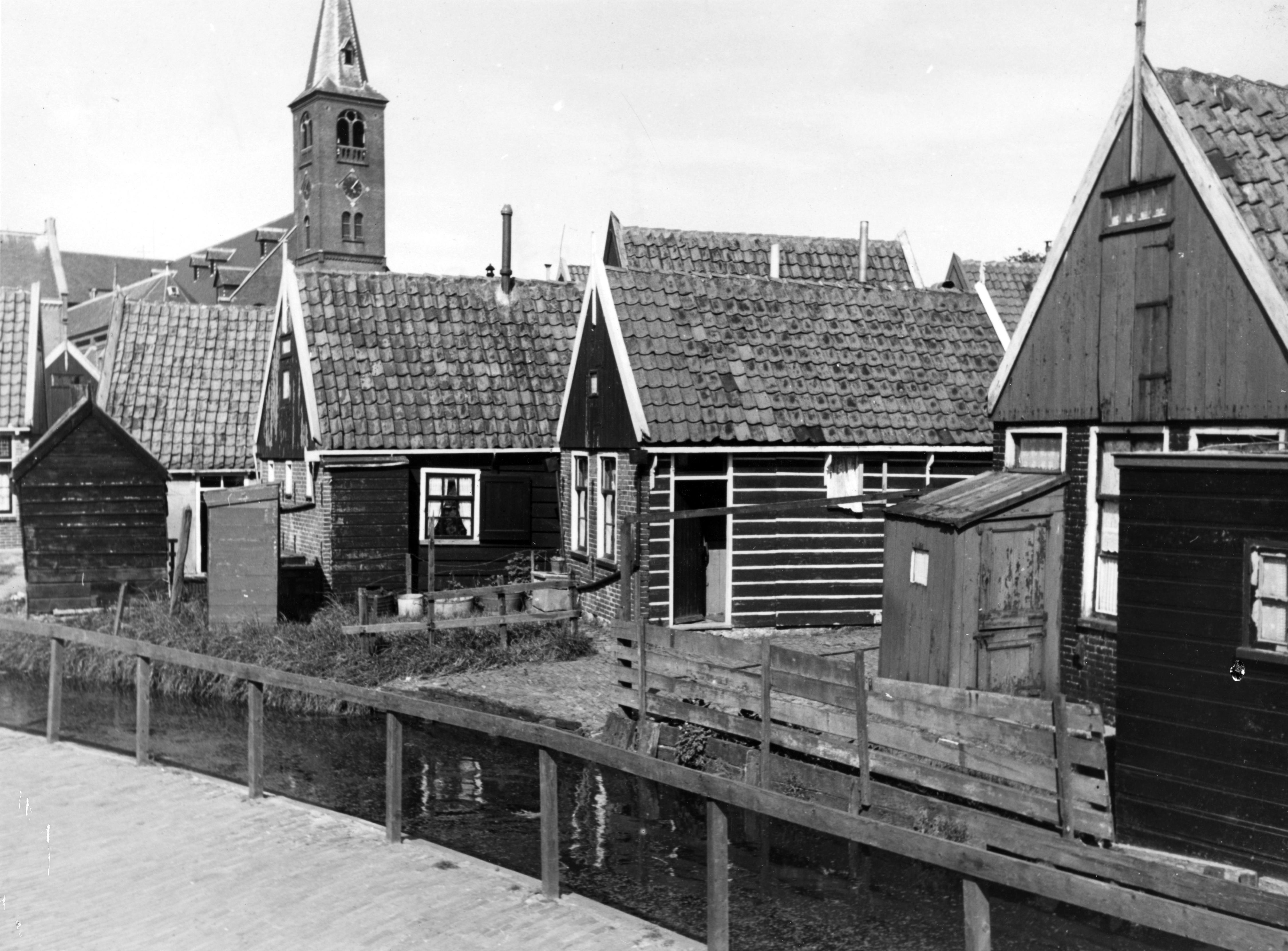 Visserswoningen in Volendam. Op de achtergrond staat de rooms-katholieke Sint-Vincentiuskerk.