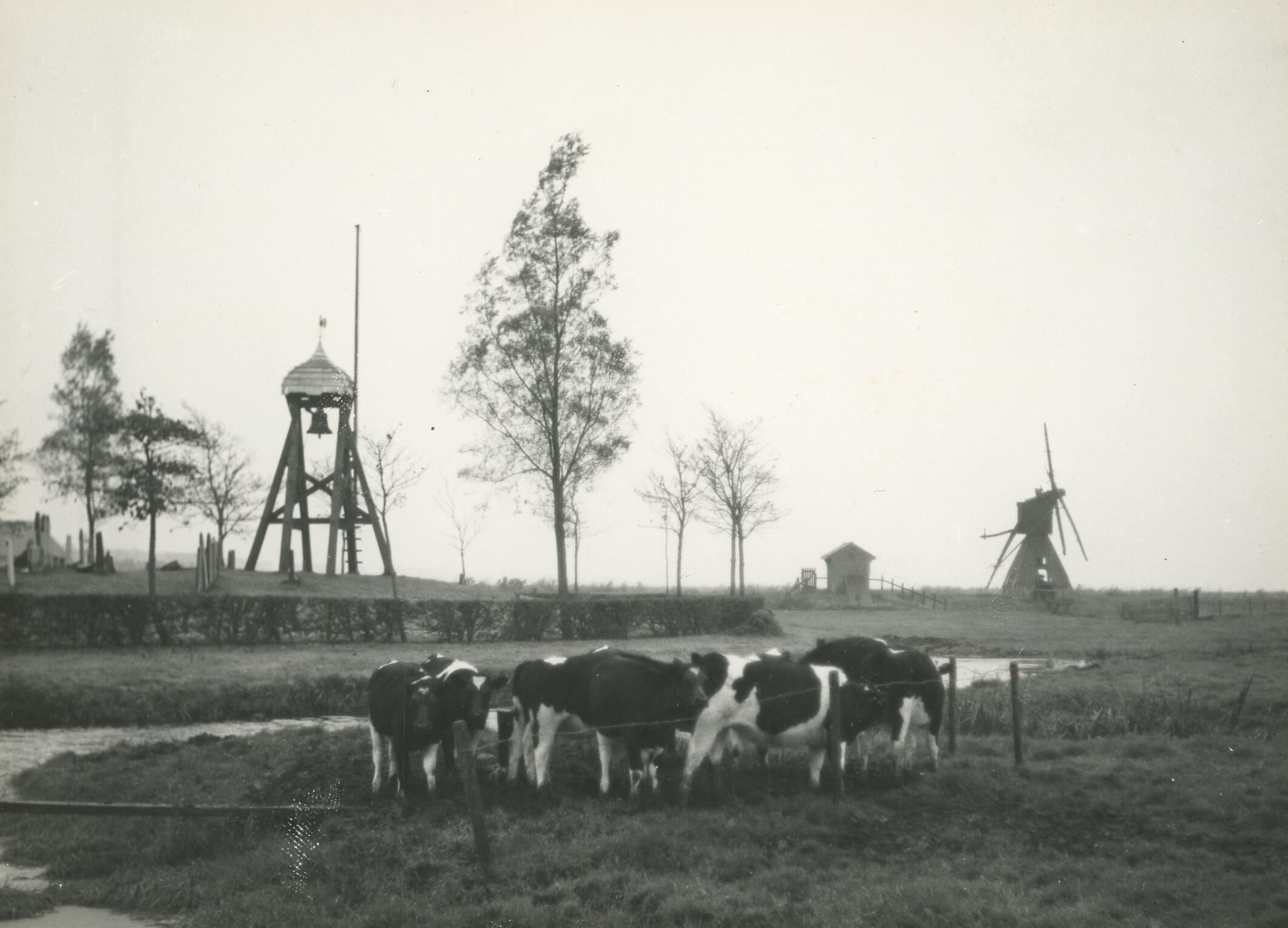 De klokkenstoel (links) op de begraafplaats van Follega, een dorp ten noorden van Lemmer. Aanvankelijk stond er ook een kerk bij deze begraafplaats, maar deze is gesloopt aan het eind van de zeventiende of het begin van de achttiende eeuw. In de klokkenstoel hangt een klok van P. van den Ghein uit 1596, met een ...