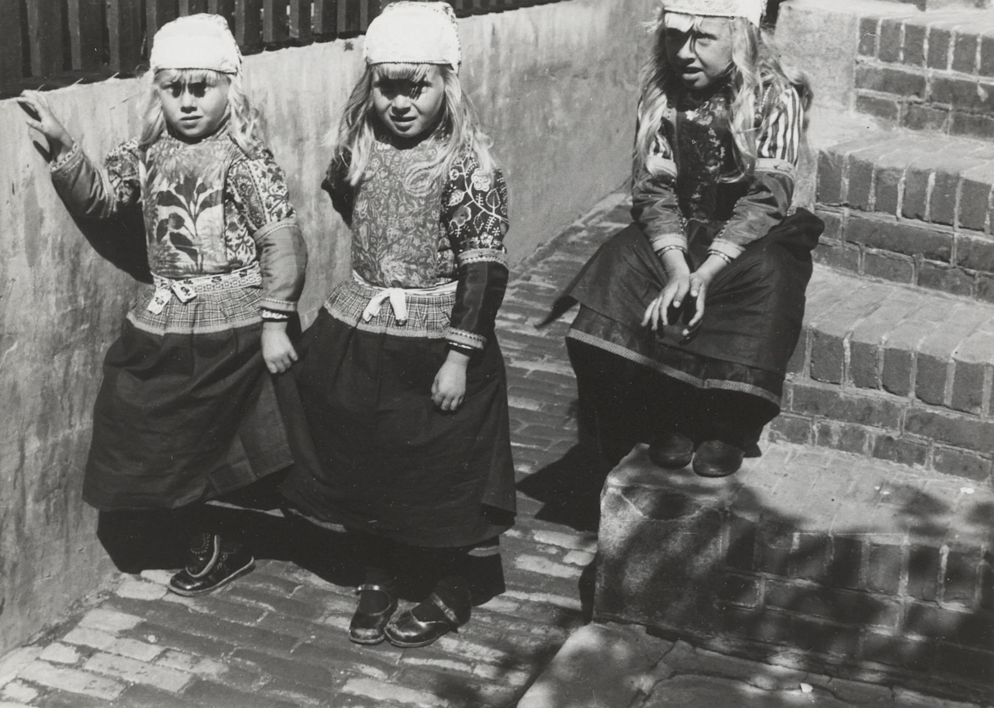 Drie meisjes in streekdracht van Marken, circa 1939 (zwart-wit foto)