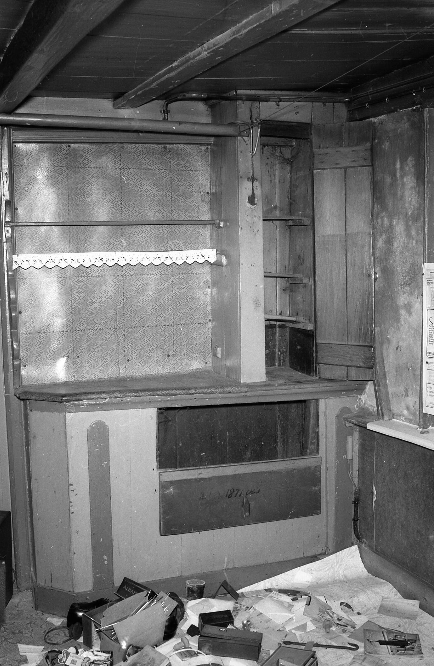 Hoekkast in een woning op Urk, 1965 (zwart-wit negatief)