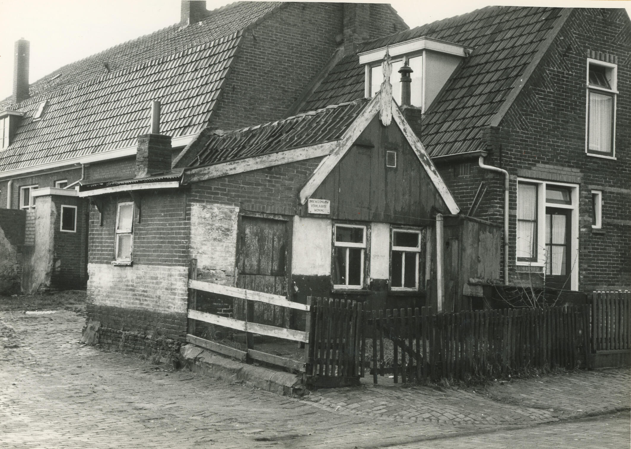 Het huis waar de Urker mandenmaker J. Nentjes zijn ambacht uitoefende. Op de gevel hangt een bordje met de tekst 'onbewoonbaar verklaarde woning'.