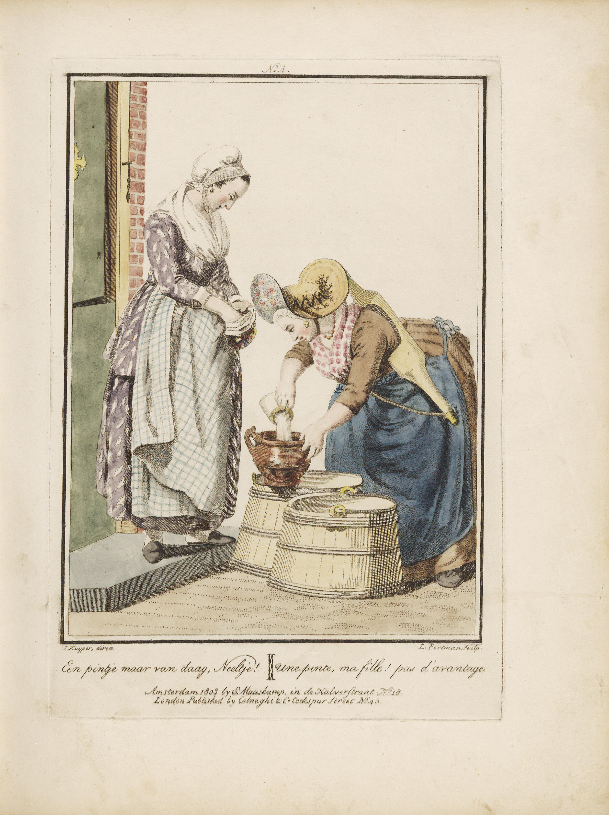 Ingekleurde gravure; Plaat 4 uit: Afbeeldingen van de kleeding, zeden en gewoonten in de bataafsche republiek, met den aanvang der negentiende eeuw = Tableaux de l'habillement, des ... / door E. Maaskamp. - Amsterdam : E. Maaskamp, 1803. In 1829 heeft Maaskamp de prenten opnieuw uitgegeven. In details en inkleuring zijn ze soms aangepast.