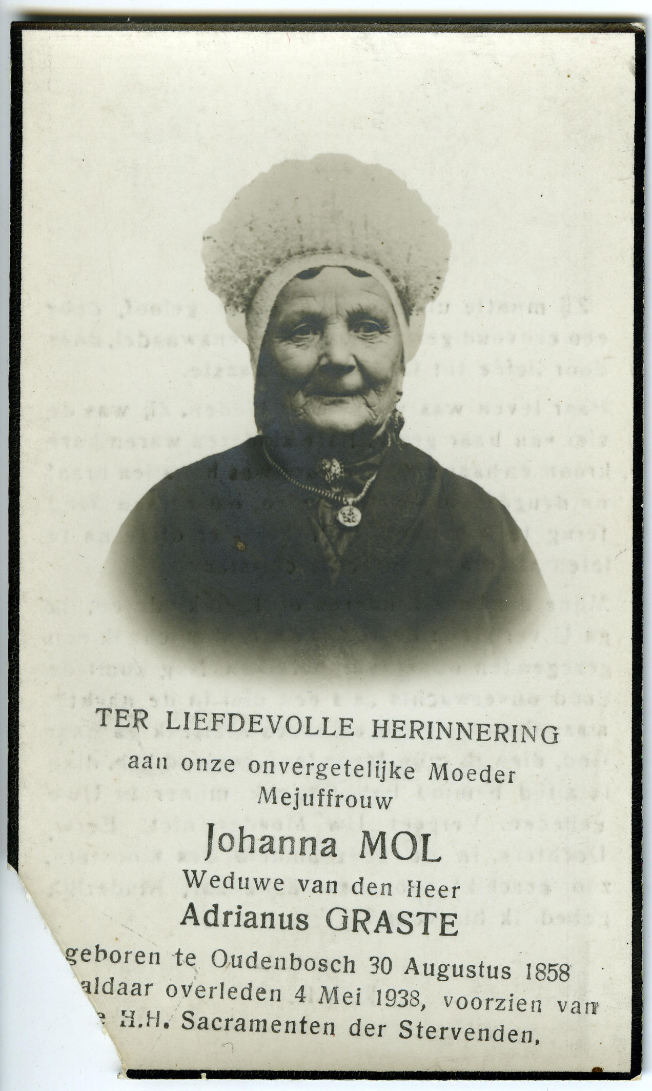 Bidprentje ter gedachtenis aan Johanna Graste-Mol, geboren in Oudenbosch op 30 augustus 1858 en overleden aldaar op 4 mei 1938. Johanna is gekleed in westelijk Noord-Brabantse streekdracht.