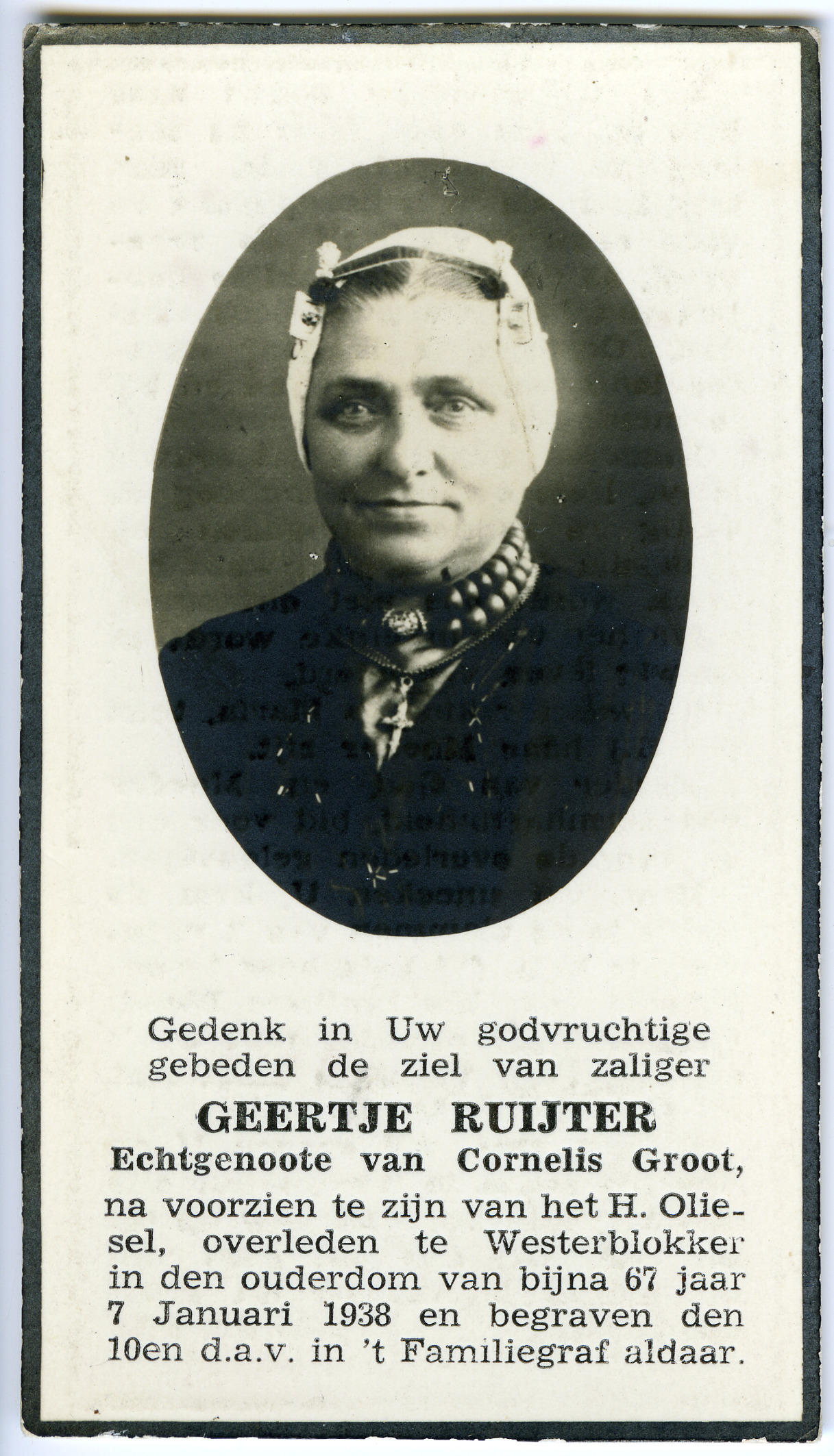 Bidprentje ter gedachtenis aan Geertje Groot-Ruijter, geboren op 18 januari 1871 in Blokker en overleden op 7 januari 1938 in Westerblokker. Geertje is gekleed in West-Friese streekdracht.